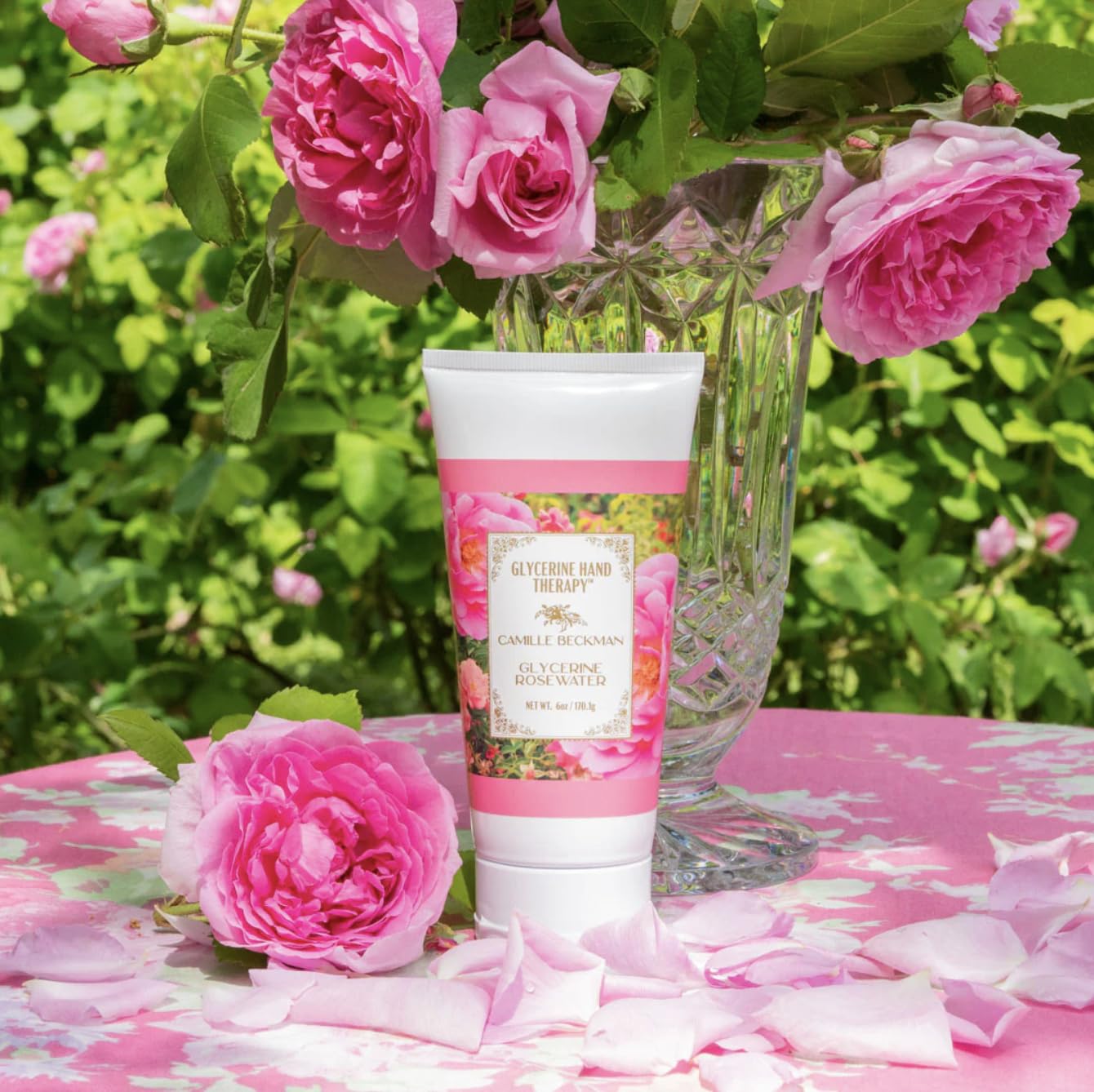 Camille Beckman Essentials Gift Basket, Glycerine Rosewater, Glycerine Hand Therapy 6 oz, Silky Body Cream 13 oz, Hand and Shower Cleansing Gel 13 oz, Glycerine Soap 3.5 oz