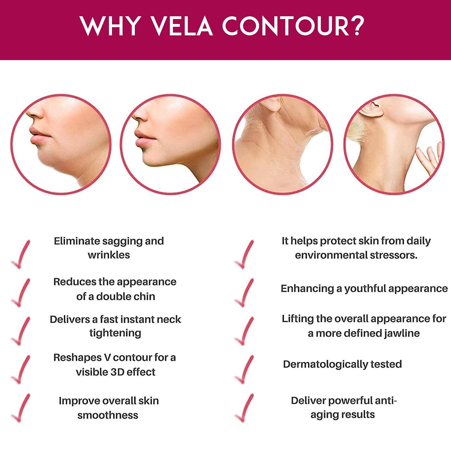- Get Rid of Double Chin and Saggy Neck Skin with the Vela Contour V Firming Anti-Aging Mask designed to shape the V line on your face. It helps tighten the jawline skin, reduce double chins, and improve your facial shape for a slimmer and firmer look Vela Contour Mask Effective Facial Treatment that reduces fine lines and wrinkles. Visibly lifts up your under-chin skin. Jaw and neckline toning. Shaping face line. Reduces double chin