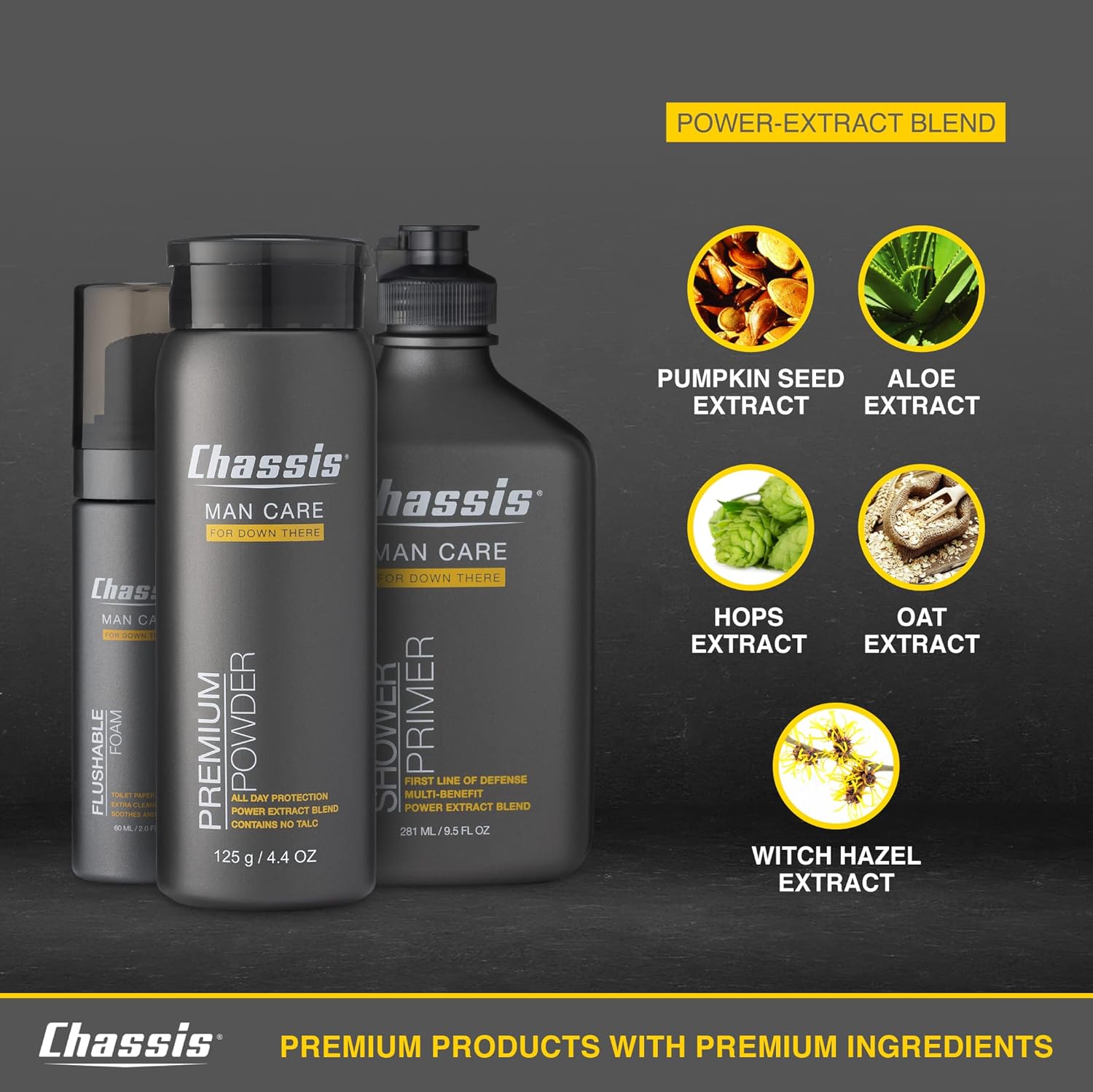 - BODY POWDER FOR MEN: Keep your motor running with Chassis Premium Powder, the ultimate odor protection, chafing prevention, and sweat reduction—all in one convenient product. Chassis powder features the exclusive Hydro-Shield Technology and Power Extract Blend. Chassis specializes in natural care for your undercarriage with products that last all day.