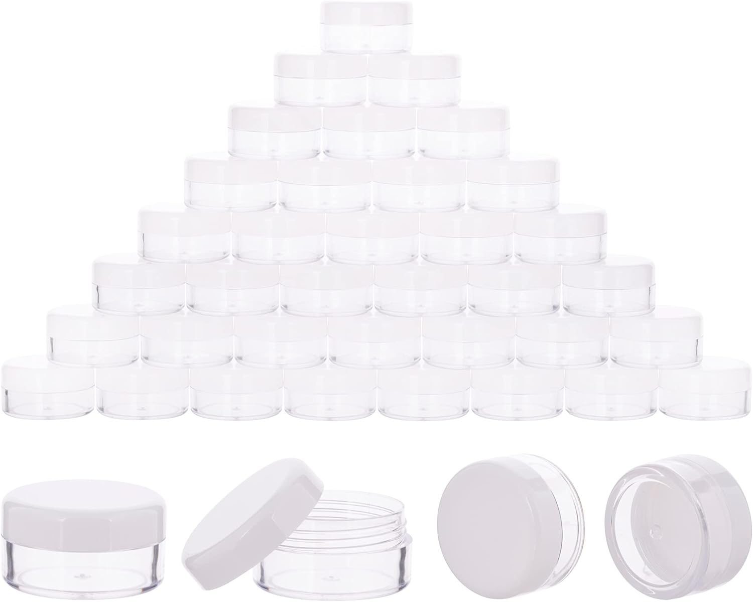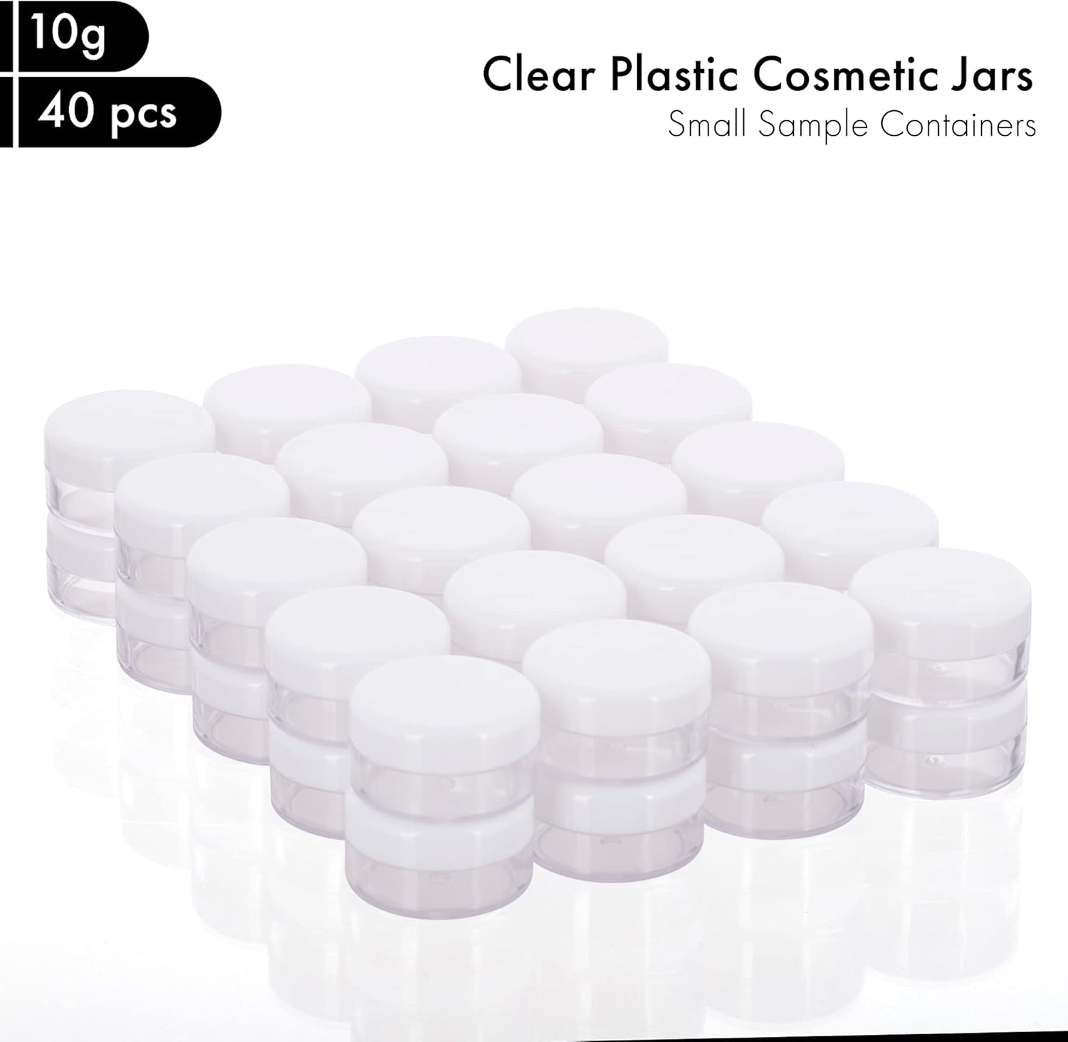- Plastic Cosmetic Containers:40pcs x 10gram plastic jar containers. 6 Colors: Black lids, Clear lids, Pink lids, Blue lids, White lids, Green lids.