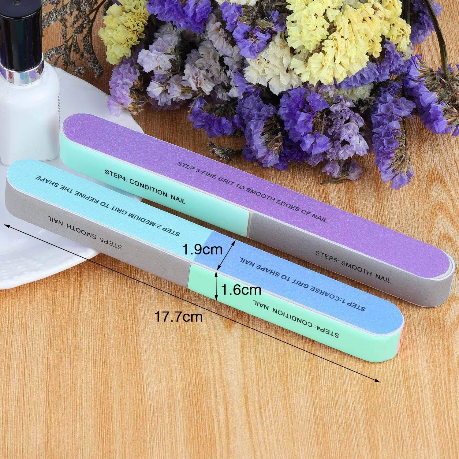 - Step 1.Coarse grit to shape nail;Step 2.Medium grit to refine the shape;Step 3.Fine grit to smooth edfes of nail;Step 4.Condition nail;Step5.Smooth Nail;Step6.Nail buffer; Step 7.Polish&Shine