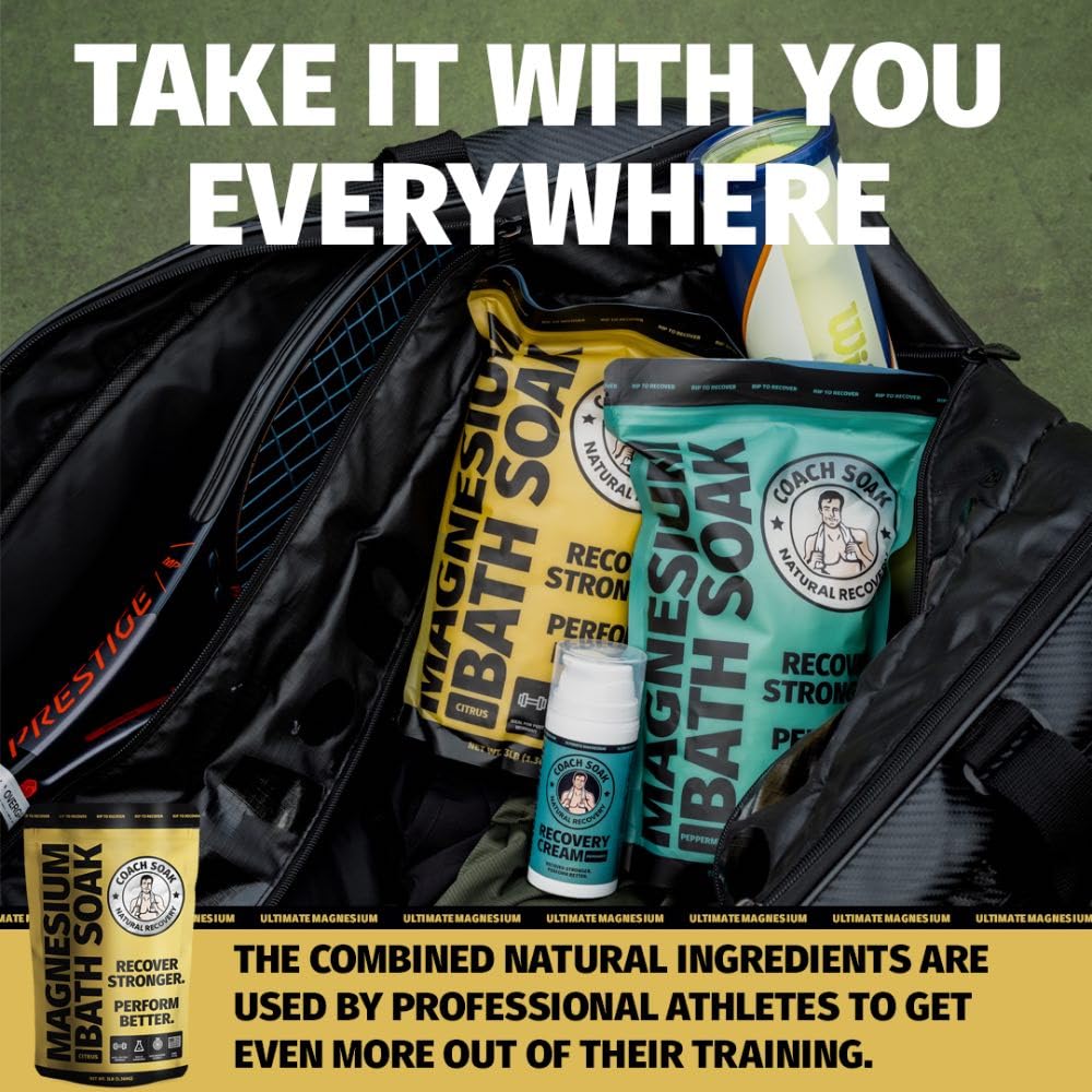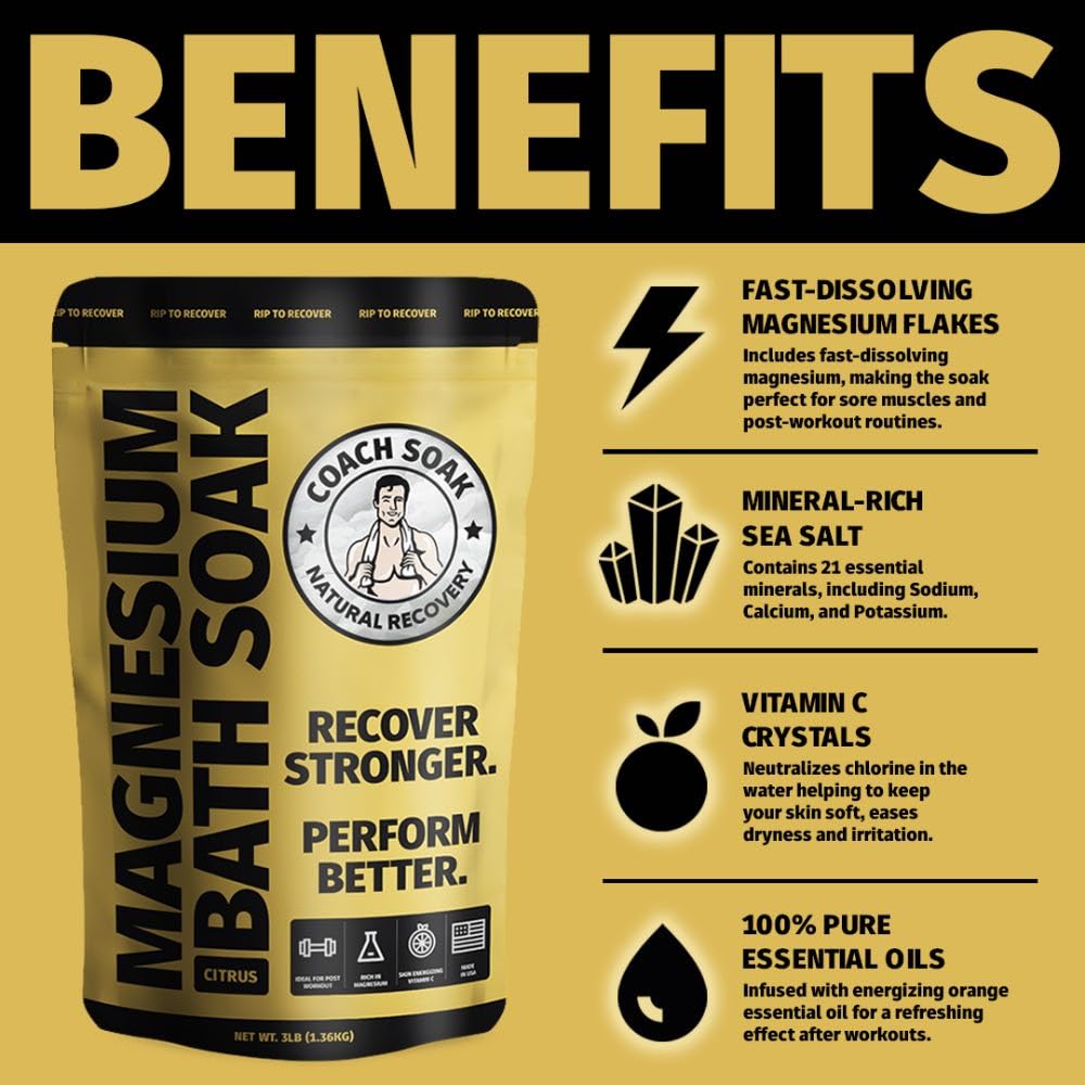 Coach Soak Recovery Bath Soak - Faster Absorption Than Epsom Salt for Pain - Rejuvenating Magnesium Flakes with 21 Minerals, Essential Oils & Bath Salts, 3lbs (Energizing Citrus)