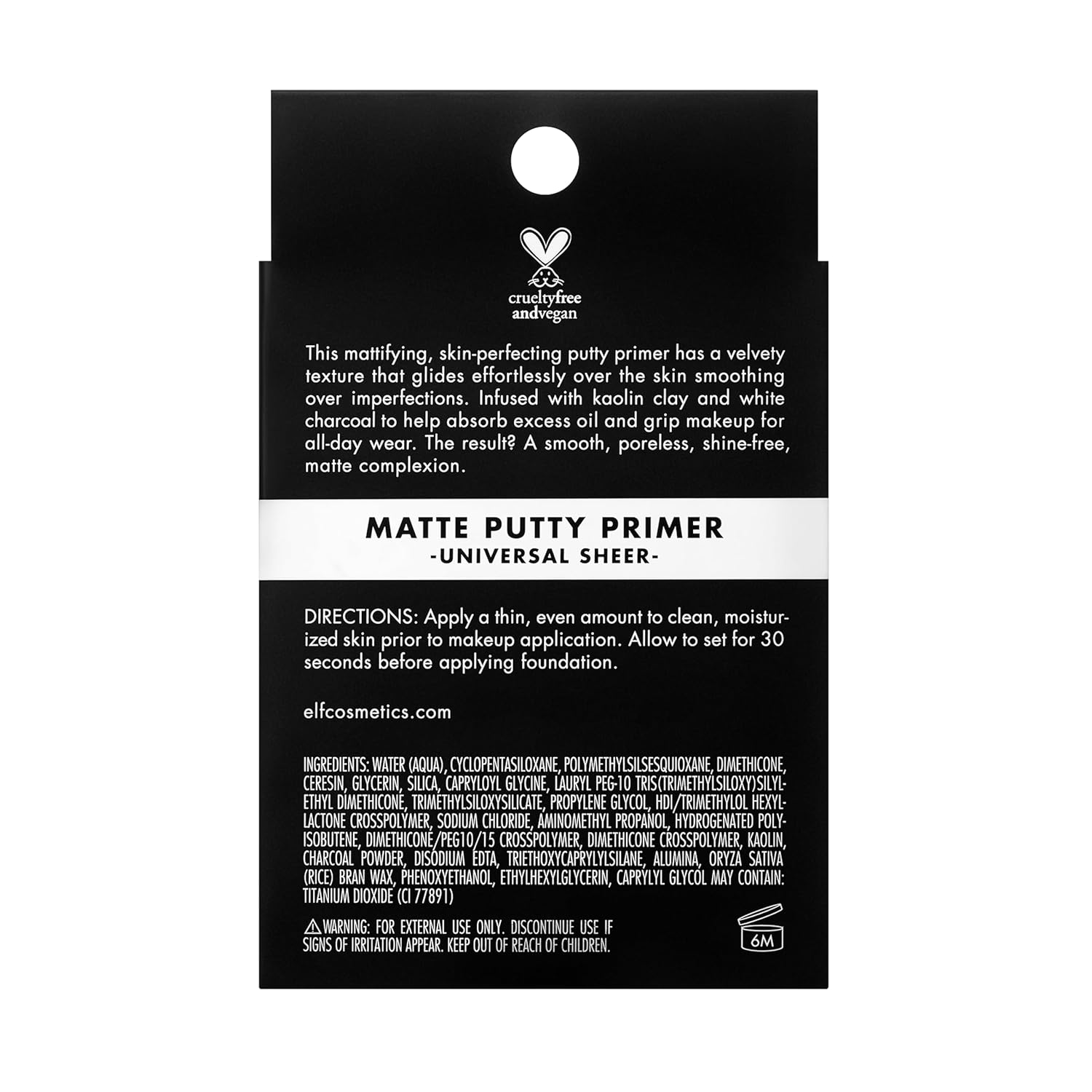 - SHINE FREE FINISH: This skin perfecting putty primer is infused with kaolin and white charcoal. Velvety texture glides effortlessly over the skin, smoothing over imperfections for a poreless effect