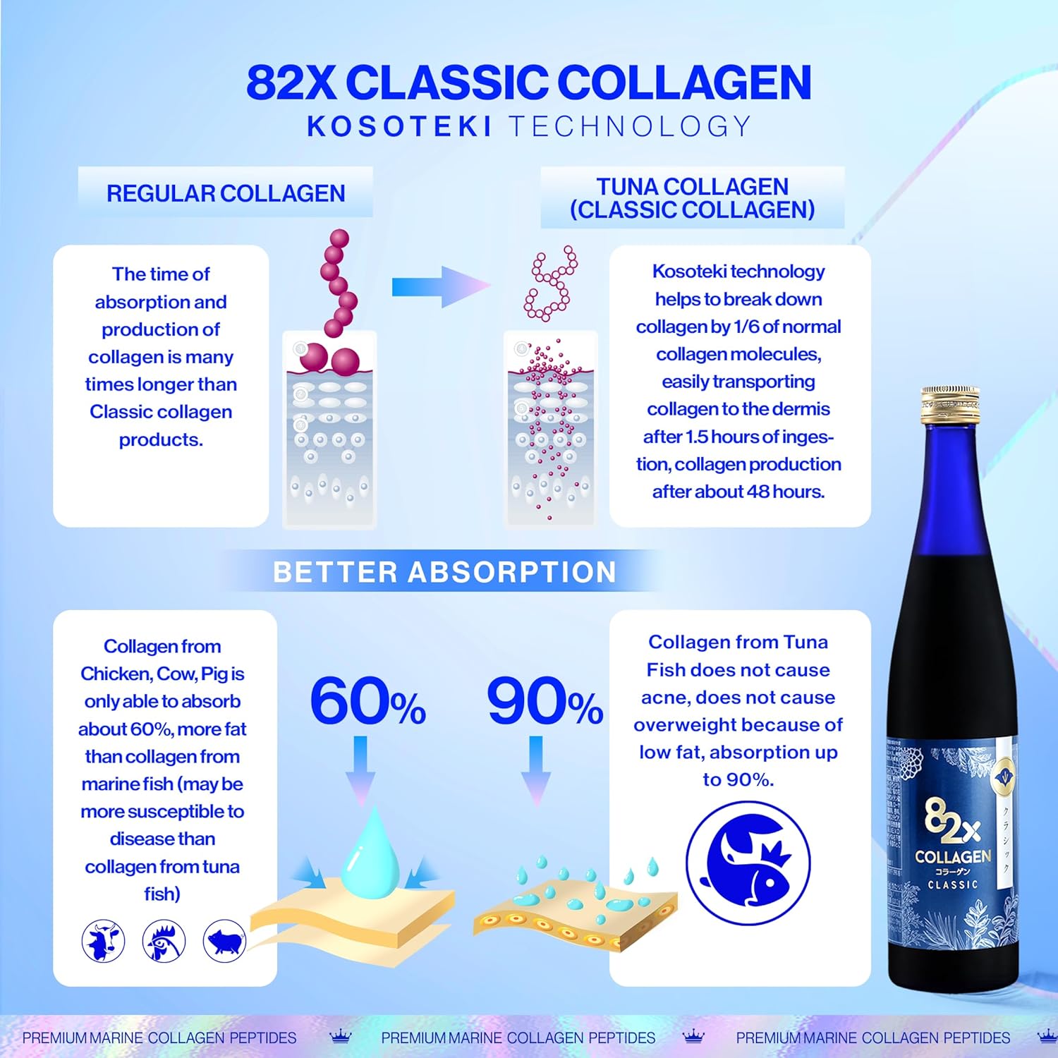 - 120,000mg LIQUID MARINE COLLAGEN If you're not digesting your collagen powder properly, you might not be getting the full benefits! Our Marine Peptides Collagen, utilizing Kosoteki technology, creates micro collagen molecules for efficient absorption, with up to 90% absorption within 1.5 hours. Formulated with 82 types of naturally fermented plants, this product supports skin hydration and elasticity without causing breakouts or discomfort.