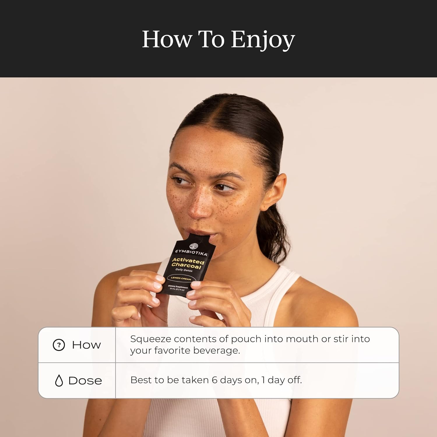 CYMBIOTIKA Activated Charcoal Liquid Supplement Packets from Coconuts for Bloating, Gut Health & Digestive Support, Helps Detox, Vitamin E, Lemon Cream Flavor, Vegan, 26 Pack
