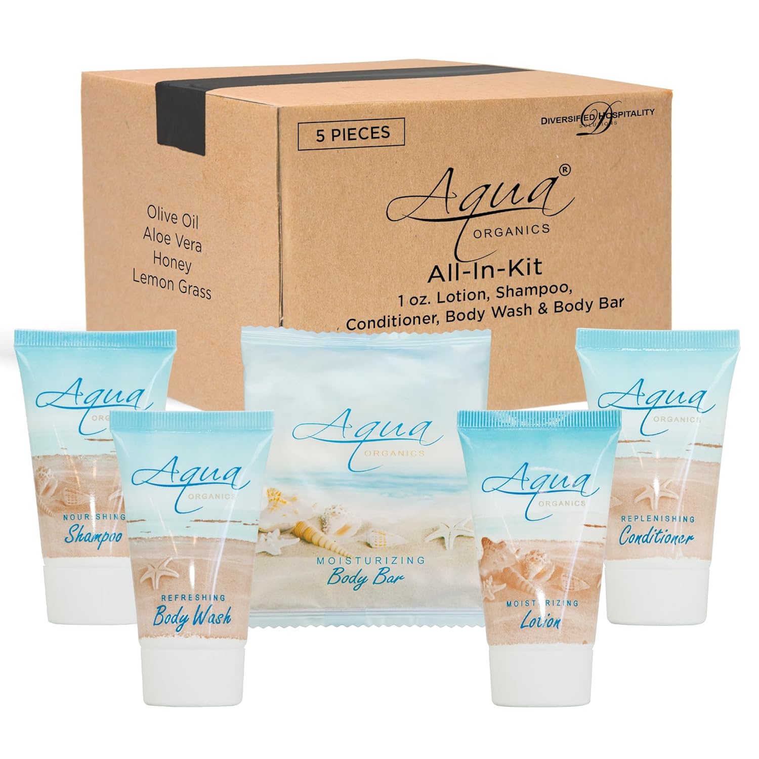 | Aqua Organics Hotel Soaps and Toiletries Bulk Set | Amenities for Hotels & Airbnb | 1oz Hotel Shampoo & Conditioner, Body Wash, Body Lotion & 1oz Bar Soap Travel Size | 5 Pieces