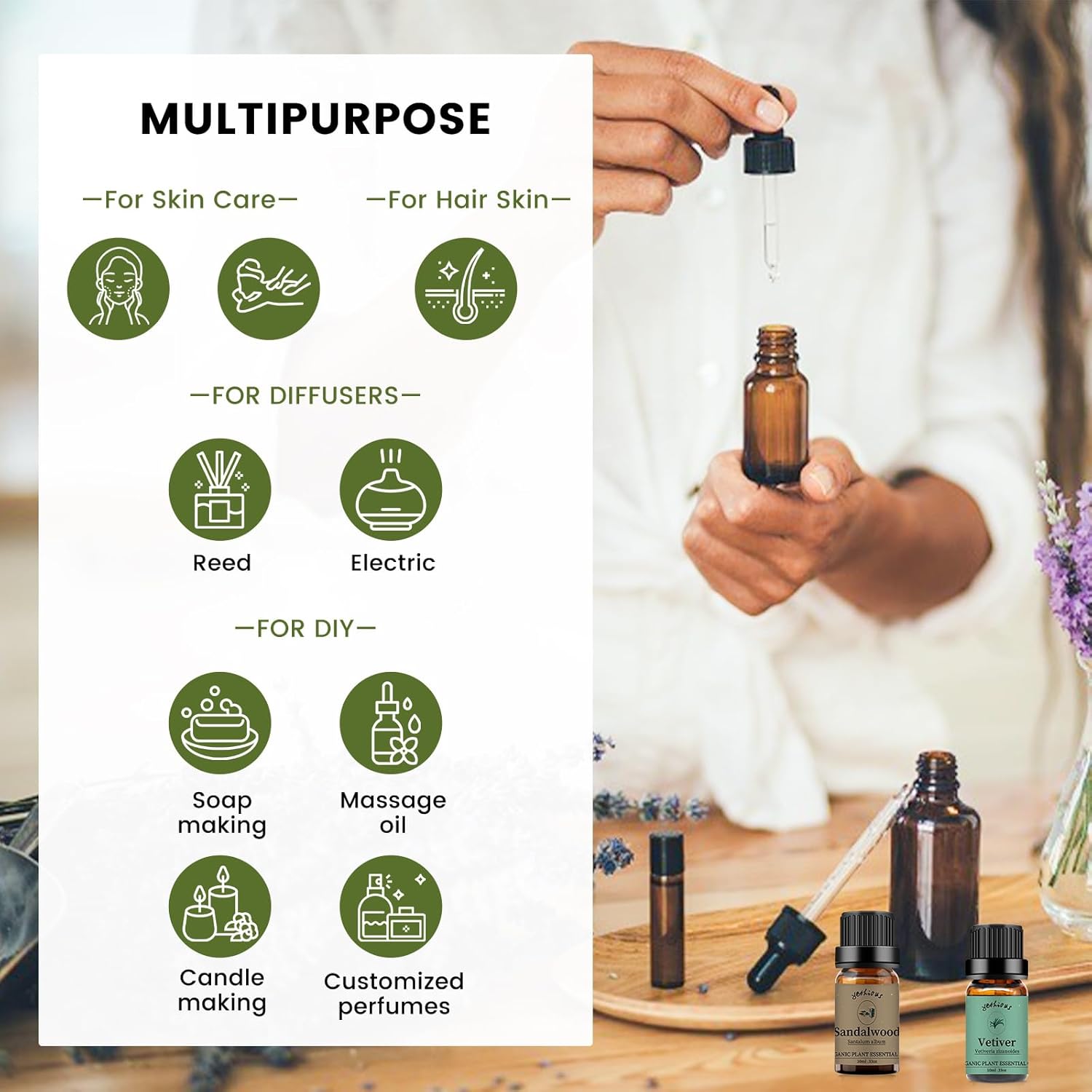 - 100% Pure vetiver and sandalwood essential oil: No additives or fillers. yethious scented oil is bottled in a durable and beautiful amber glass bottle.