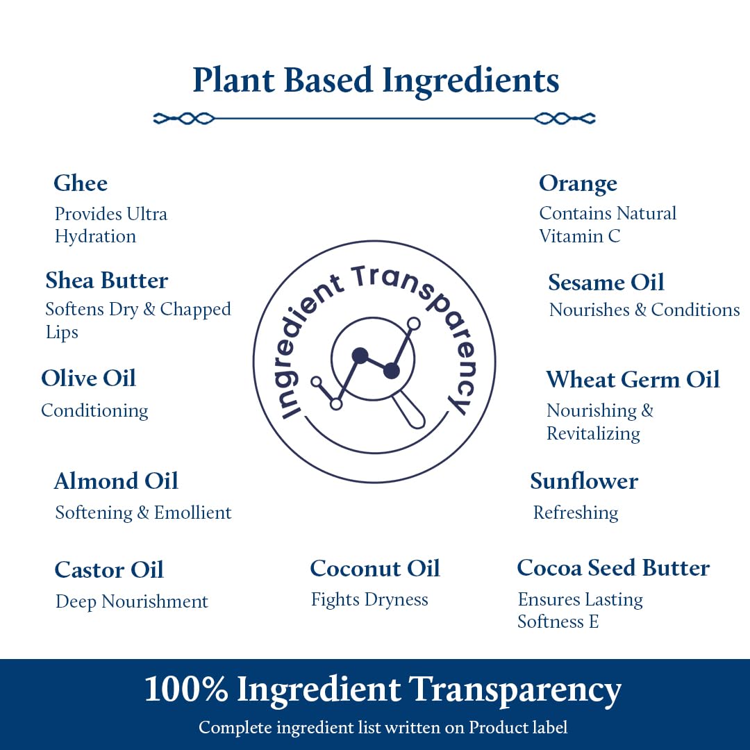 - CONTAINS GHEE and 8 NATURAL OILS and Natural Vitamin C: Rich in Natural Oils that helps in long lasting moisturization for the glowing brightened Skin. Vitamin C from Orange extract helps in Lip brightening and adds to lip gloss