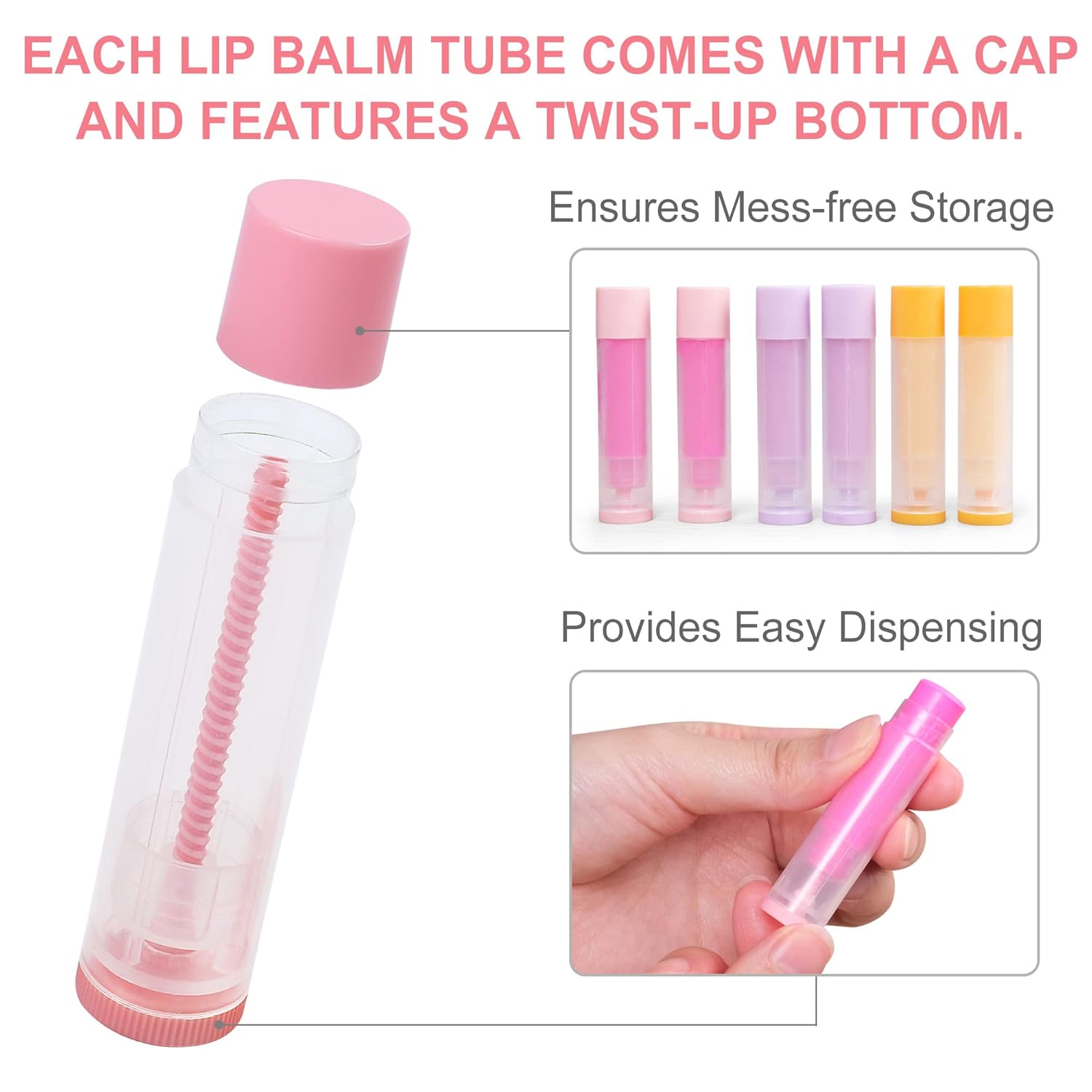 - 【EASY TO USE】Our lip balm containers come with a roll-up mechanism to effortlessly push your lip balm to the top for quick and easy application; Includes 60 pink, snug-fitting, snap-on caps that keep your product safely sealed; These tubes are similar to traditional lip balm tubes and provide a clean and clear look to your products