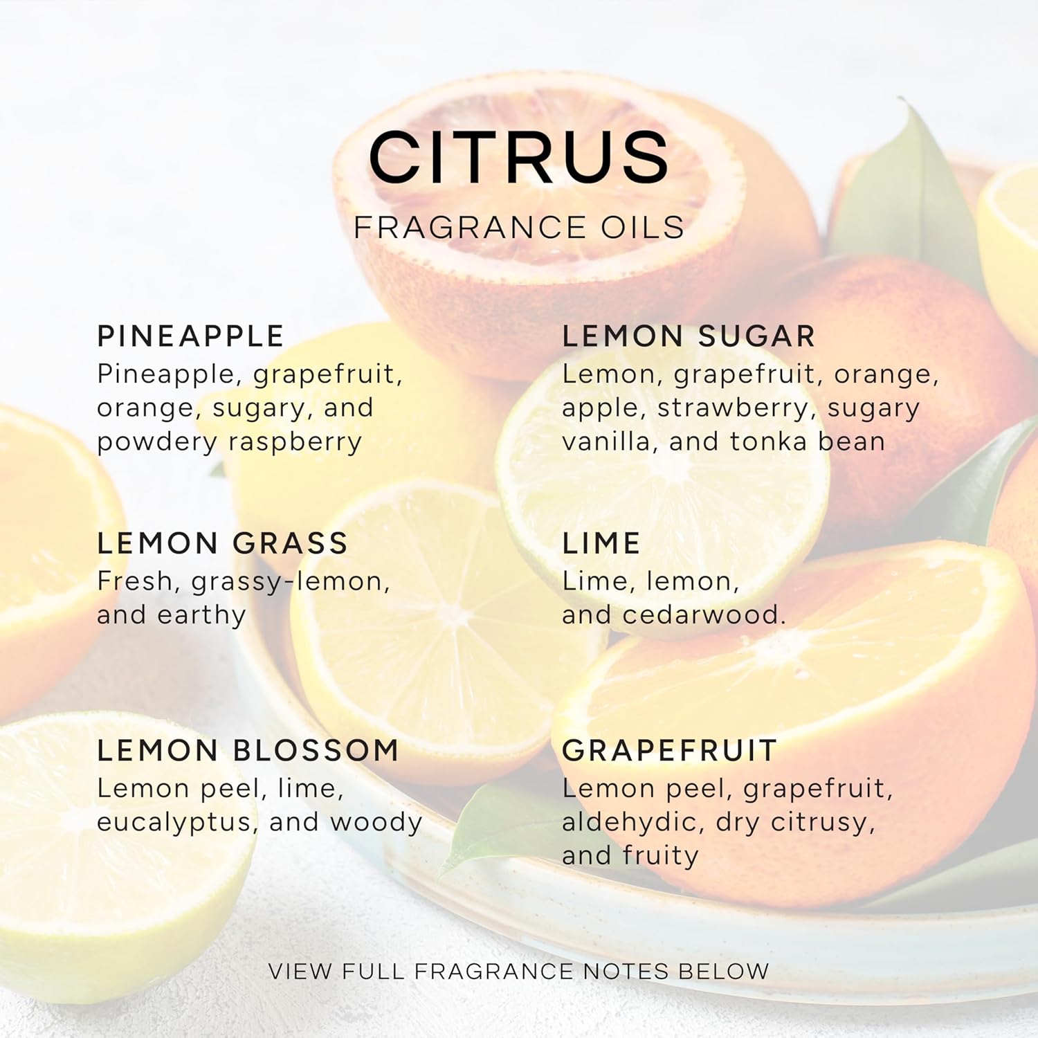 - CITRUS SCENTED OILS: Citrusy smelling scents formulated for making candles, soaps, air freshener sprays, aromatherapy diffusers, dryer sheets and cleaning products. These seasonal essential scents make the perfect gift for the whole family!