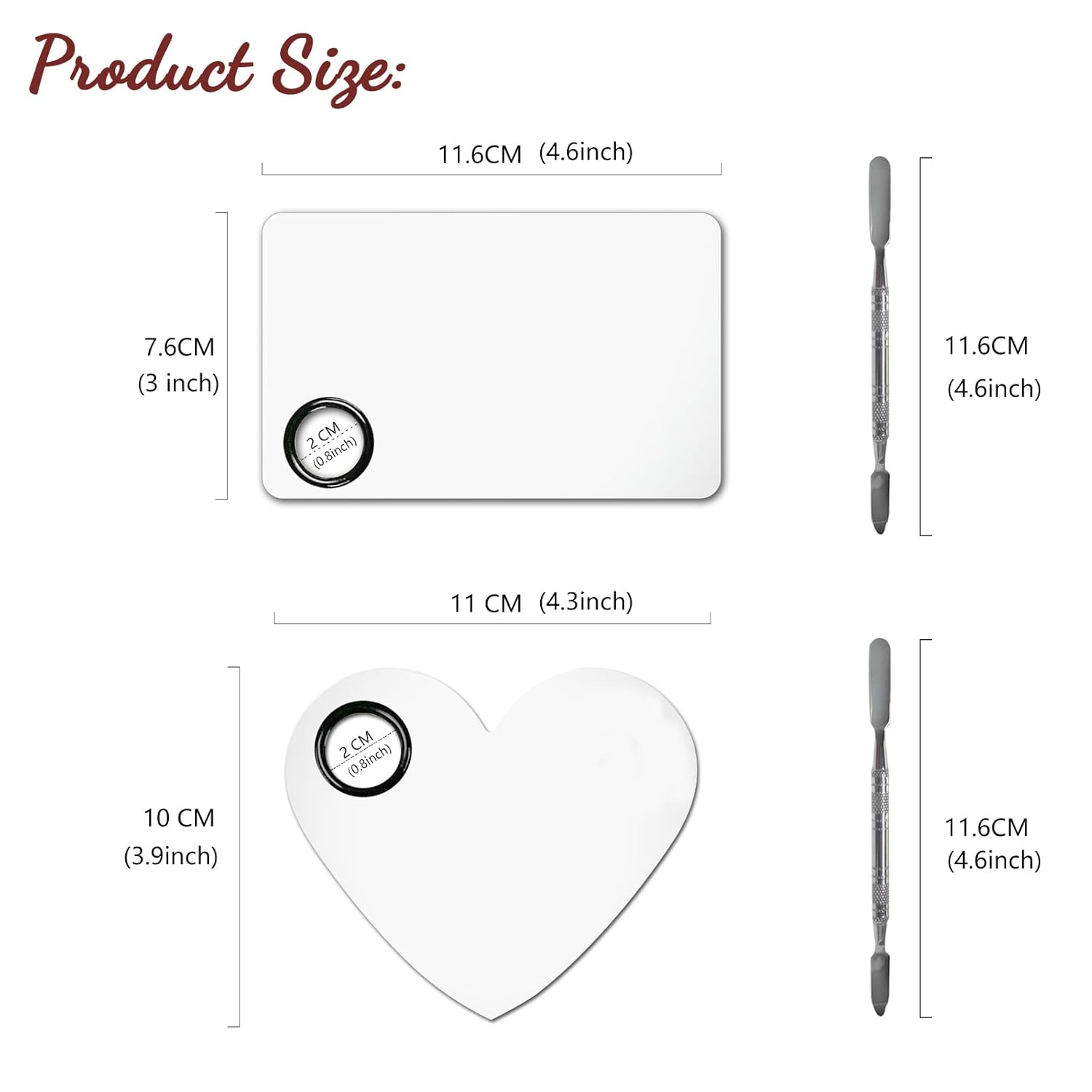 - 2.【Package Contents】: 2Pcs Makeup Palettes & 2Pcs Spatulas. 1rectangular palette (length x width: 4.6*3in) + 1 heart-shaped makeup palette (length x width: 4.3*3.9in) +2 spatulas (length: 4.6in), Small and light.