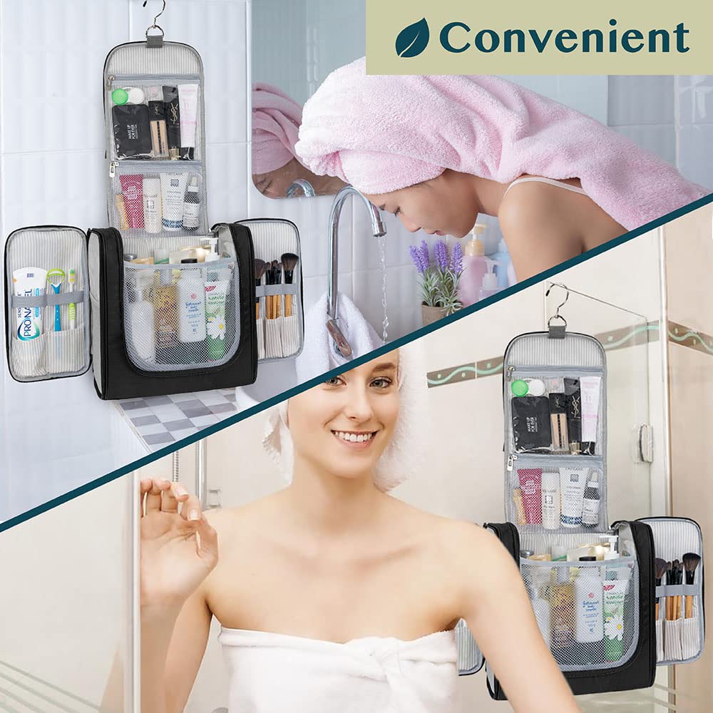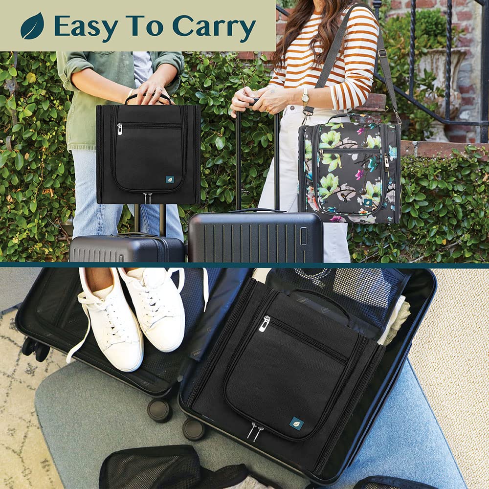 - COSMETICS TRAVEL BAG ORGANIZER: This toiletry bag for women has a hanging hook and multiple pockets that help you stay organizer during business trip, vacation travel. The hanging hook makes it easy to hang the toiletry bag to bars in the hotel shower bathroom. Unzip your toiletry bag to reveal compartments to organize your shampoo, skincare face hygiene products. This toiletry travel bag is an essential accessory for cruise in Europe, plane, Hawaii Trip, and honeymoon.