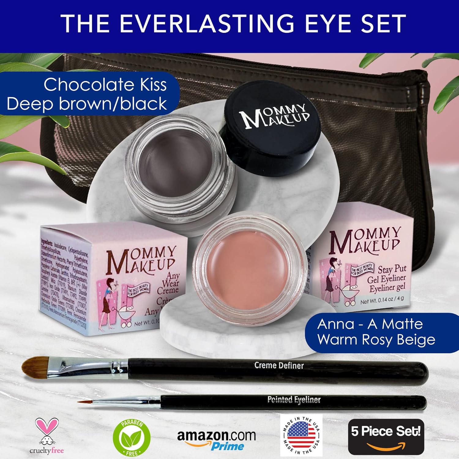 The Everlasting Eye 5 Piece Waterproof Makeup Set. Gel Eyeliner, Creme Eyeshadow, 2 brushes and Mesh Bag. Paraben-free, Talc-free, Cruelty-free. Anna/Chocolate Kiss 1202