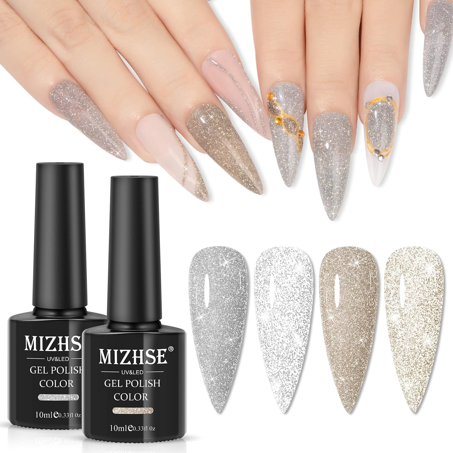 MIZHSE Reflective Gel Nail Polish, Glitter Silver and Gold Gel Polish 2 Colors, Sparkle Shiny Diamond Nail Gel Manicure Set Nail Art at Home Salon 10ML