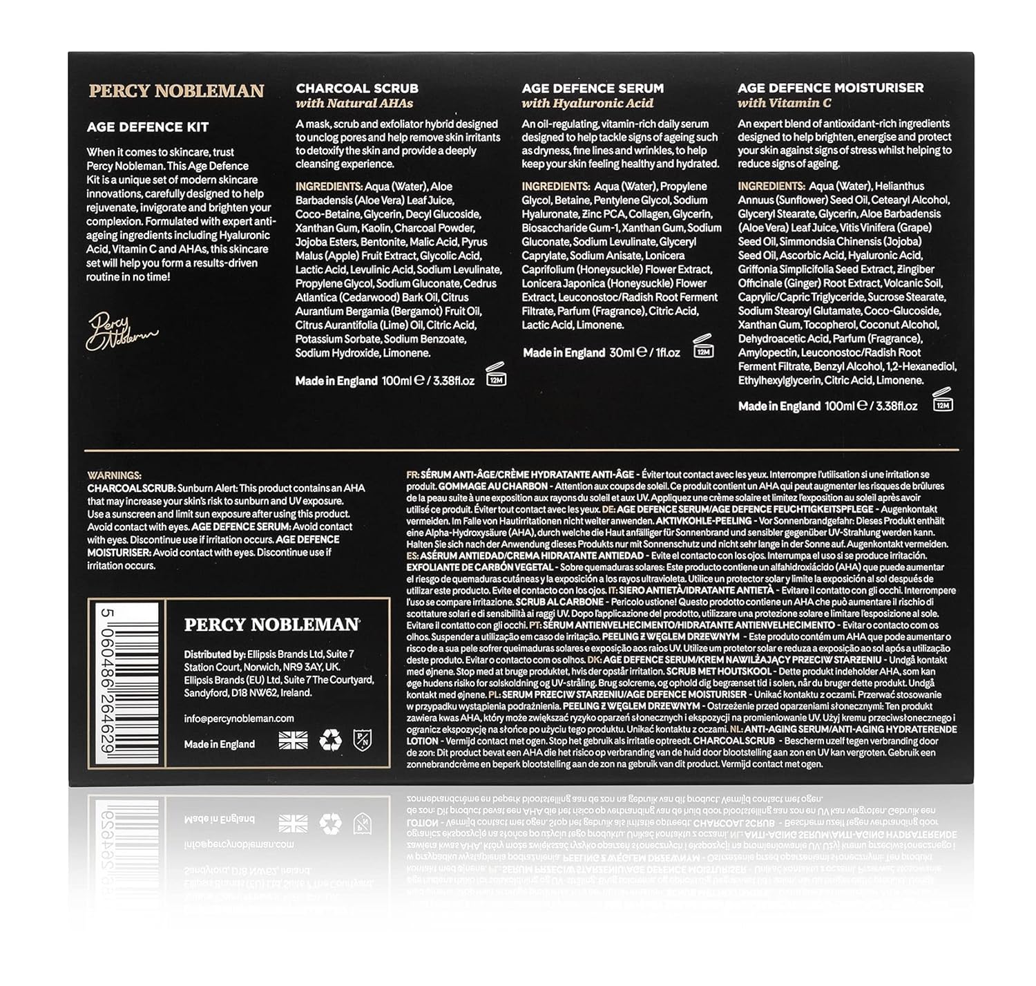 - Each kit / skincare giftset contains Percy’s deep cleansing Charcoal Scrub (with Natural AHAs), ultra-hydrating Age Defence Serum (with Hyaluronic Acid), and rejuvenating Age Defence Moisturiser (with Vitamin C).