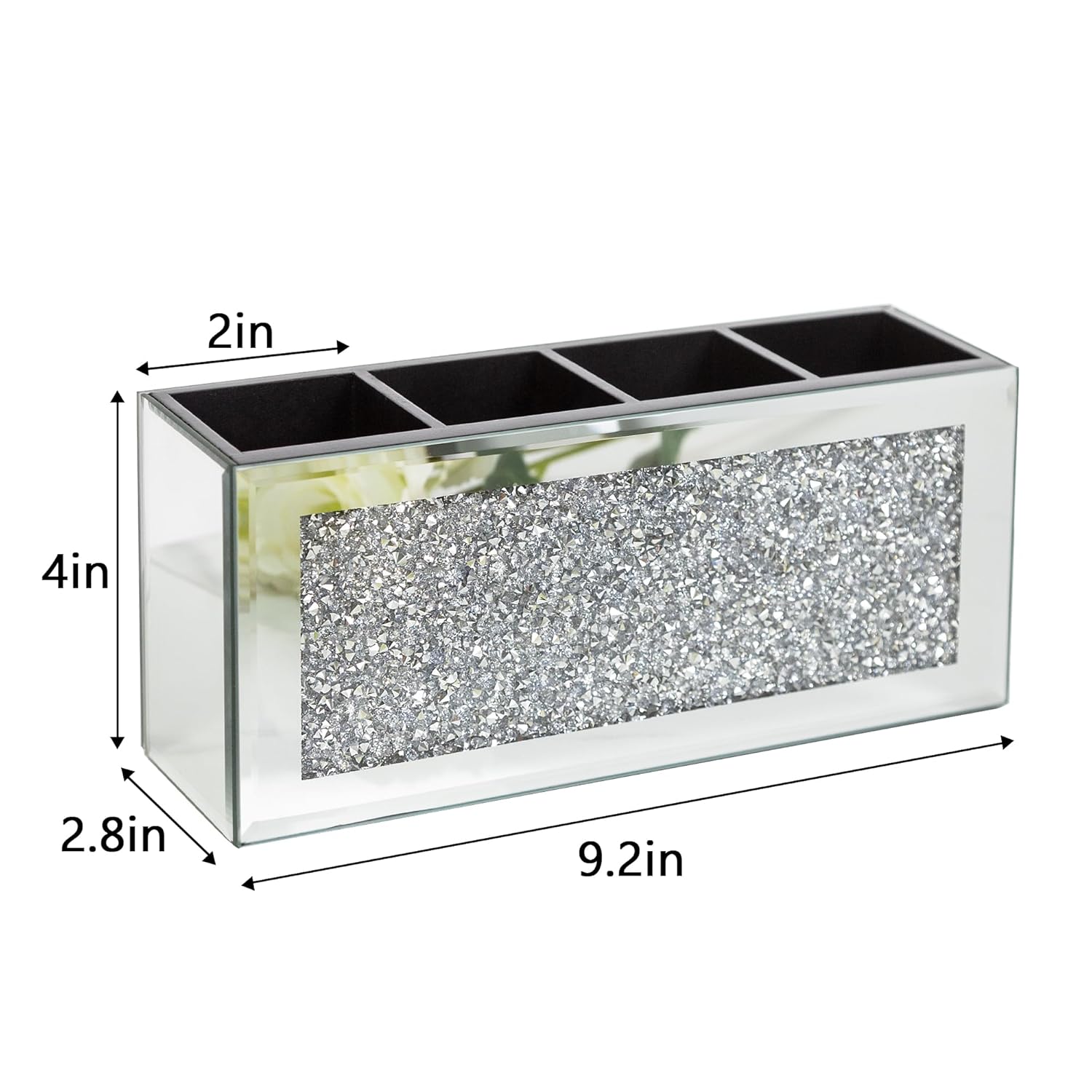 SHYFOY 4-Compartment Makeup Brush Holder, Mirrored Makeup Organizer with Crushed Diamond Crystals, Vanity Cosmetics Organizer Solution, Pencil Holder Organizer for Desk