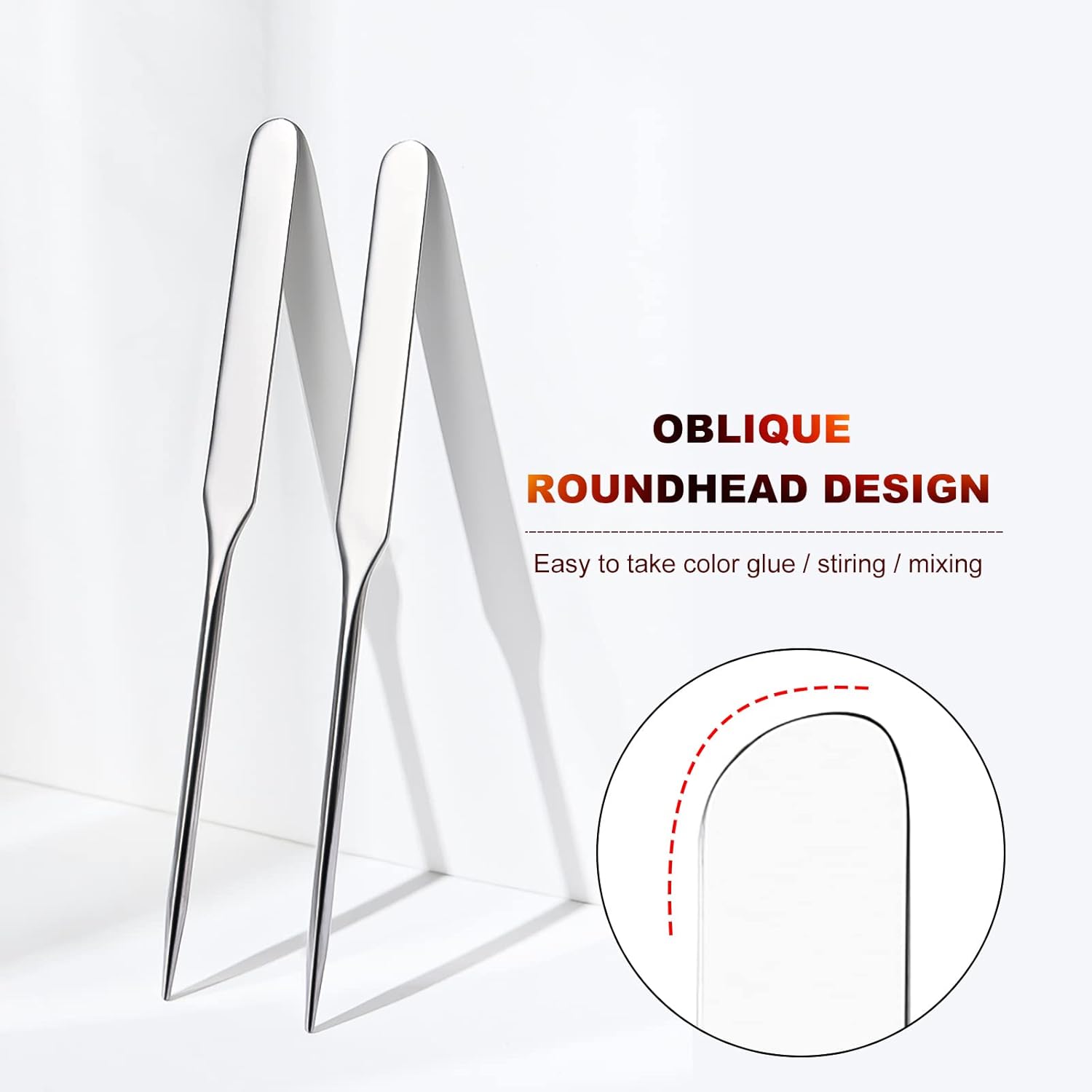 - Design: This makeup spatula is perfect for professional salons or home use. Lightweight and portable, easy to carry and use. Makeup Spatula is oblique Round Head: Ergonomic handle, easy and comfortable to hold. This makeup spatula is convenient for powder/glue/color matching.