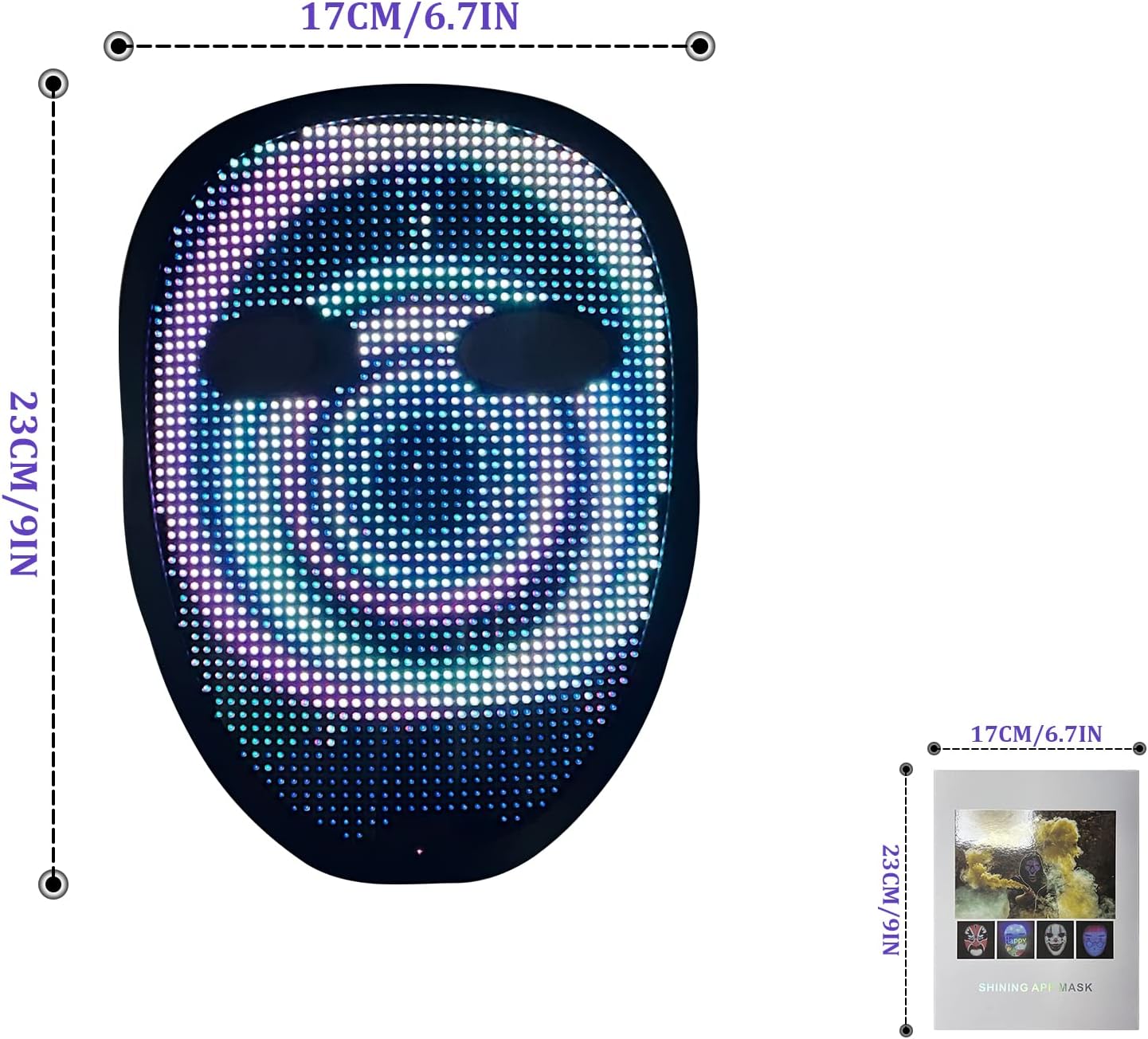 - Shining Mask Has 45 Dynamic Display Modes And 70 Static Display Images,Led Mask Can Be Set To Single Color,Flash,Gradient,Smooth And Multi-Color.After Connecting To The Led Mask Using Bluetooth-compatible,It Can Be Programmed Through The SHINING MASK APP.