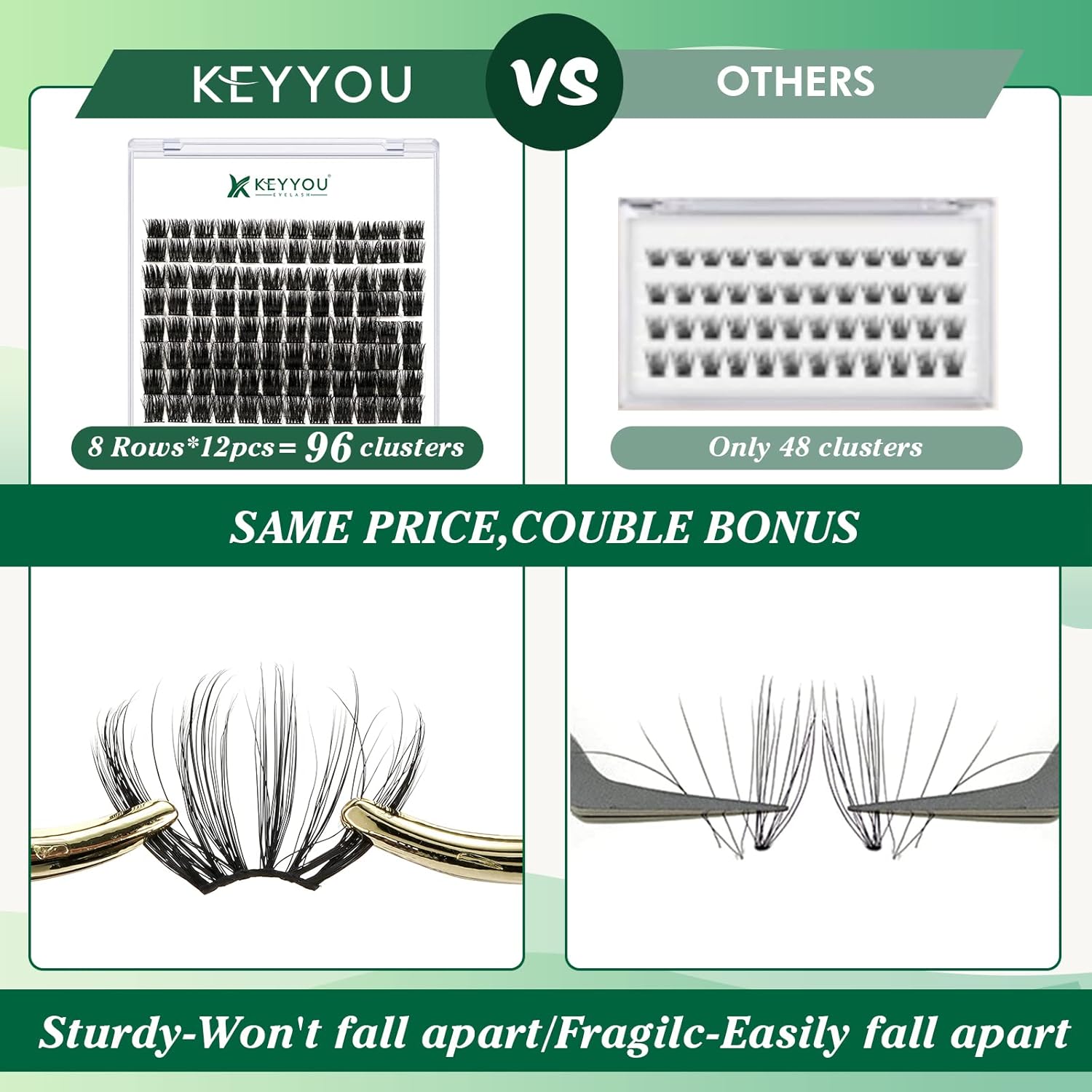 - 【Soft&Comfortable】KEYYOU lash cluster are made of imported materials,the stem line is thinner and softer, the eyelash cluster are lighter and more comfortable to wear.96 clusters in one tray ,more cost-effective.