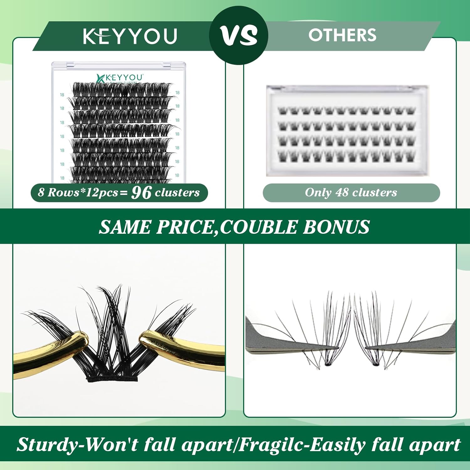 - 【Soft&Comfortable】KEYYOU lash cluster are made of imported materials,the stem line is thinner and softer, the eyelash cluster are lighter and more comfortable to wear.96 clusters in one tray ,more cost-effective.