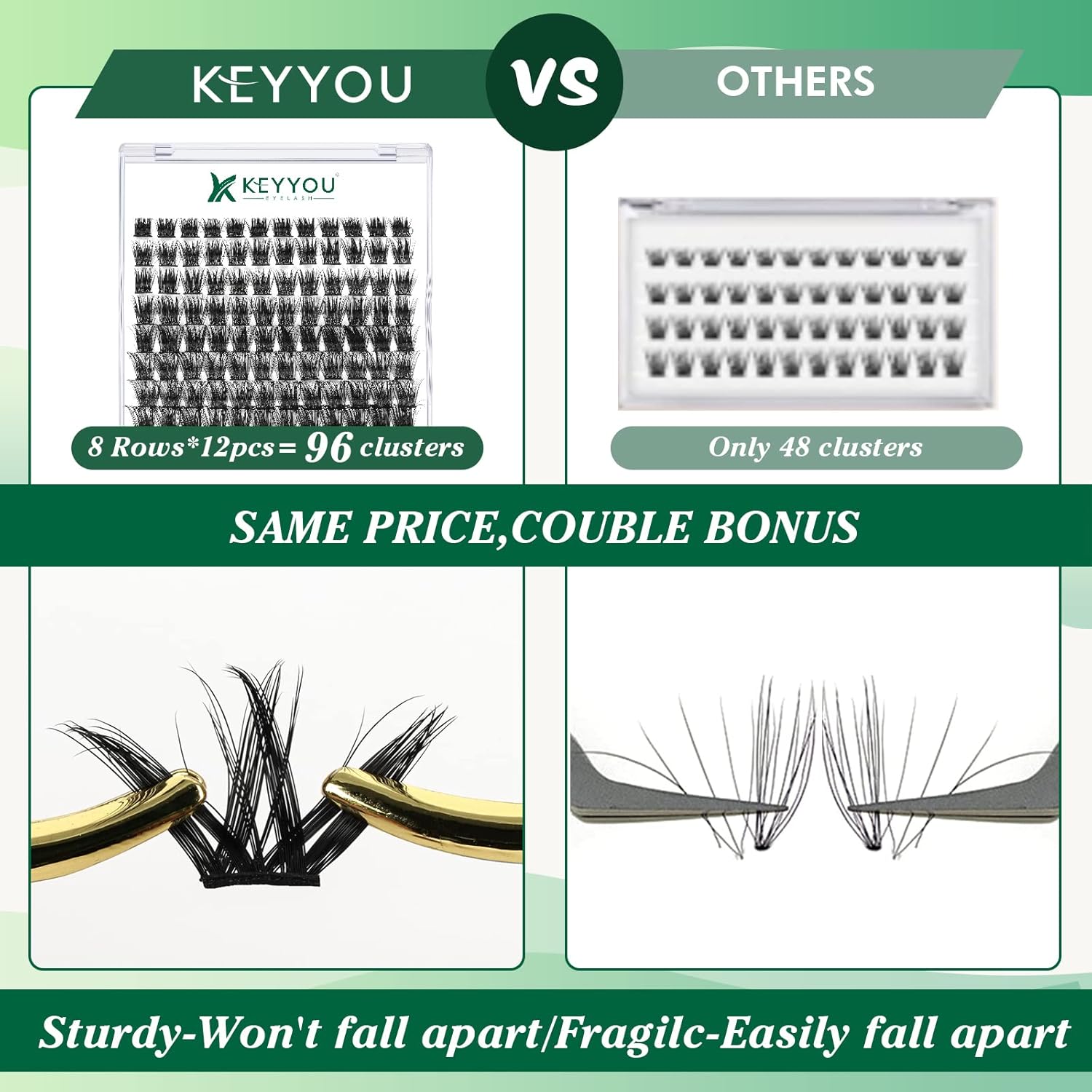 - 【Soft&Comfortable】KEYYOU lash cluster are made of imported materials,the stem line is thinner and softer, the eyelash cluster are lighter and more comfortable to wear.96 clusters in one tray ,more cost-effective.