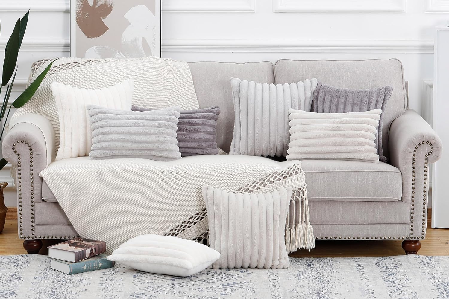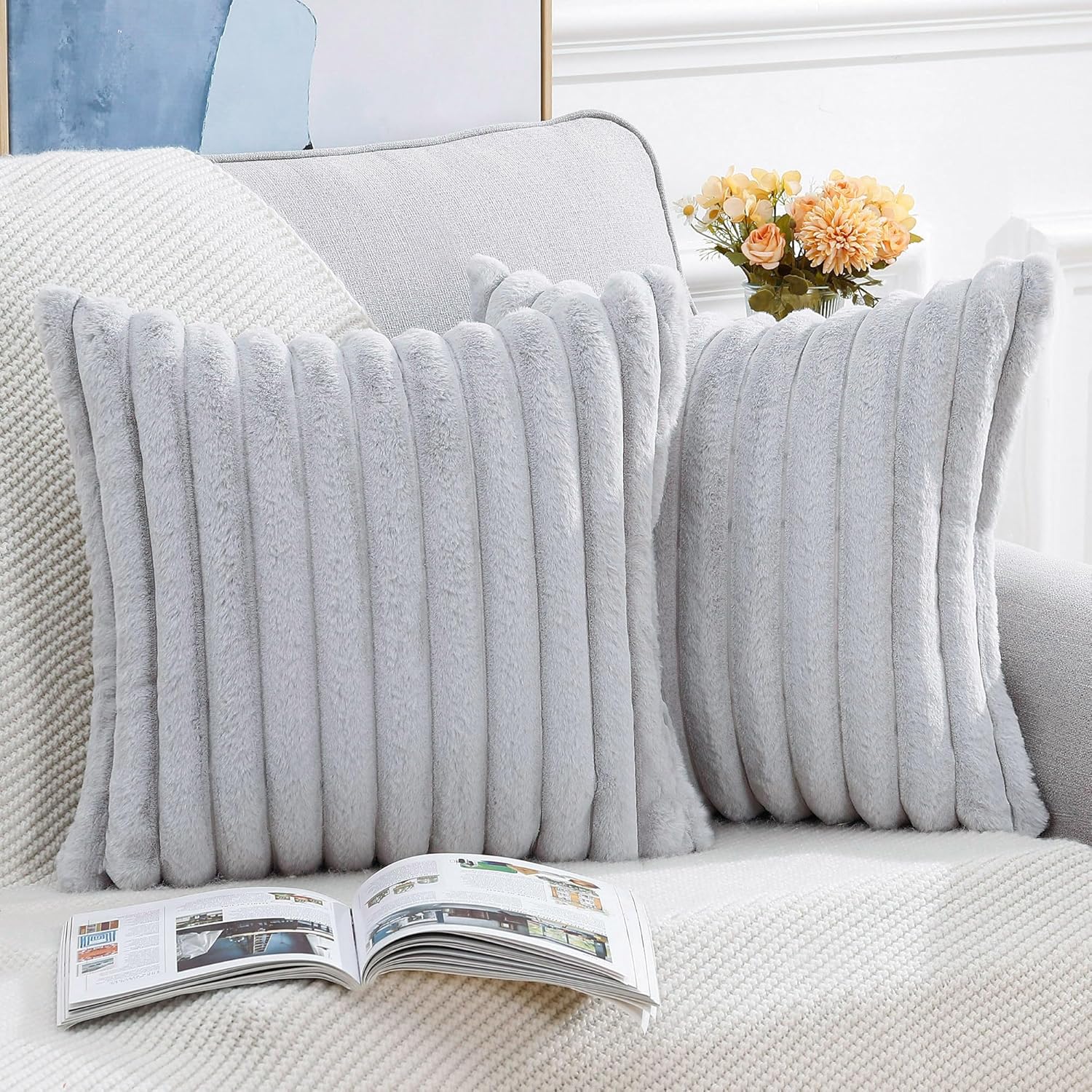 MADIZZ Set of 2 Faux Wool Plush Decorative Throw Pillow Covers 24x24 Inch Light Grey Fluffy Striped Soft Decorative Cushion Cover for Sofa Bedroom Pillow Shell