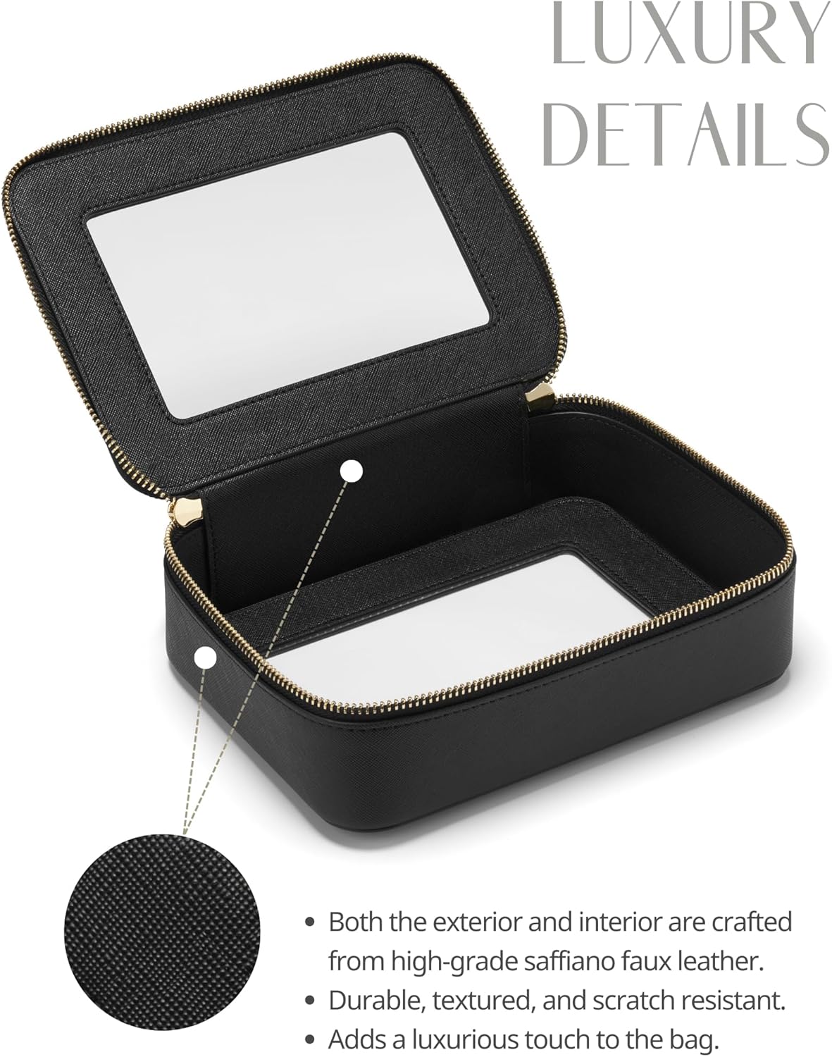 - [Premium Material and Durability] – The clear cosmetic case, both the exterior and interior, is crafted from high-grade saffiano faux leather, which is highly scratch resistant, durable and exceptionally easy to keep clean. It features a smooth zipper for secure closure, and elegant light gold metal hardware accents, adding a luxurious and sophisticated touch to the bag's overall design.