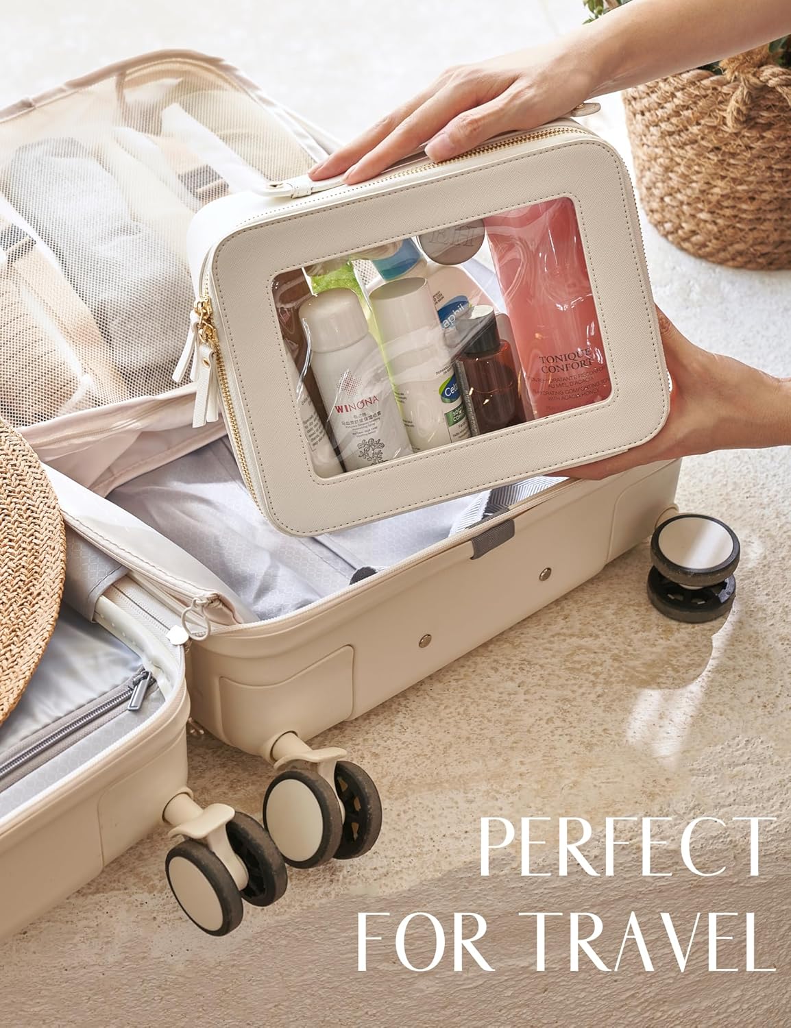 - [Premium Material and Durability] – The clear cosmetic case, both the exterior and interior, is crafted from high-grade saffiano faux leather, which is highly scratch resistant, durable and exceptionally easy to keep clean. It features a smooth zipper for secure closure, and elegant light gold metal hardware accents, adding a luxurious and sophisticated touch to the bag's overall design.