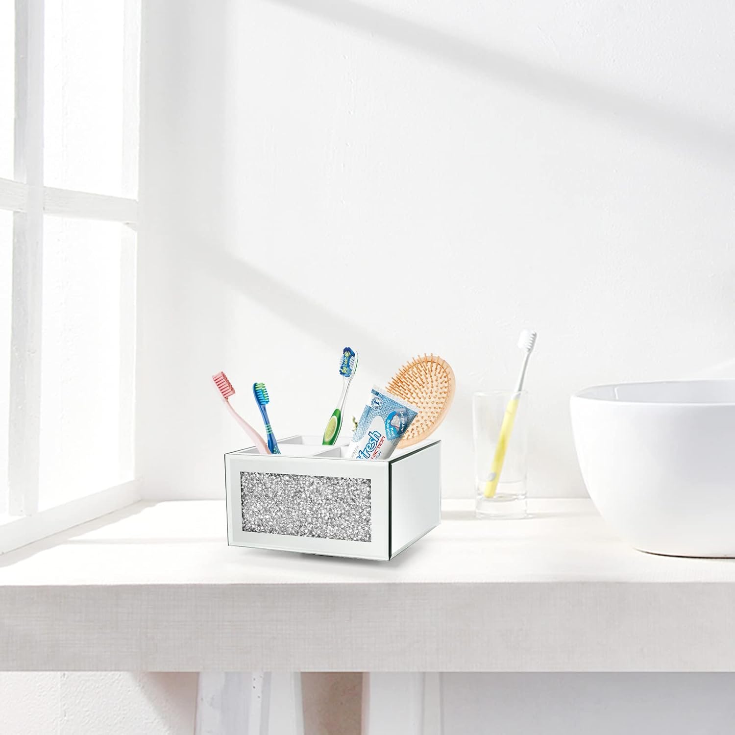 - Outstanding vanity decor: glass mirrored cosmetic brush storage, it's bling and shiny, will be an eye catching home decorative ornaments for vanity table, shelf, side table, living room, bathroom, office desk etc.