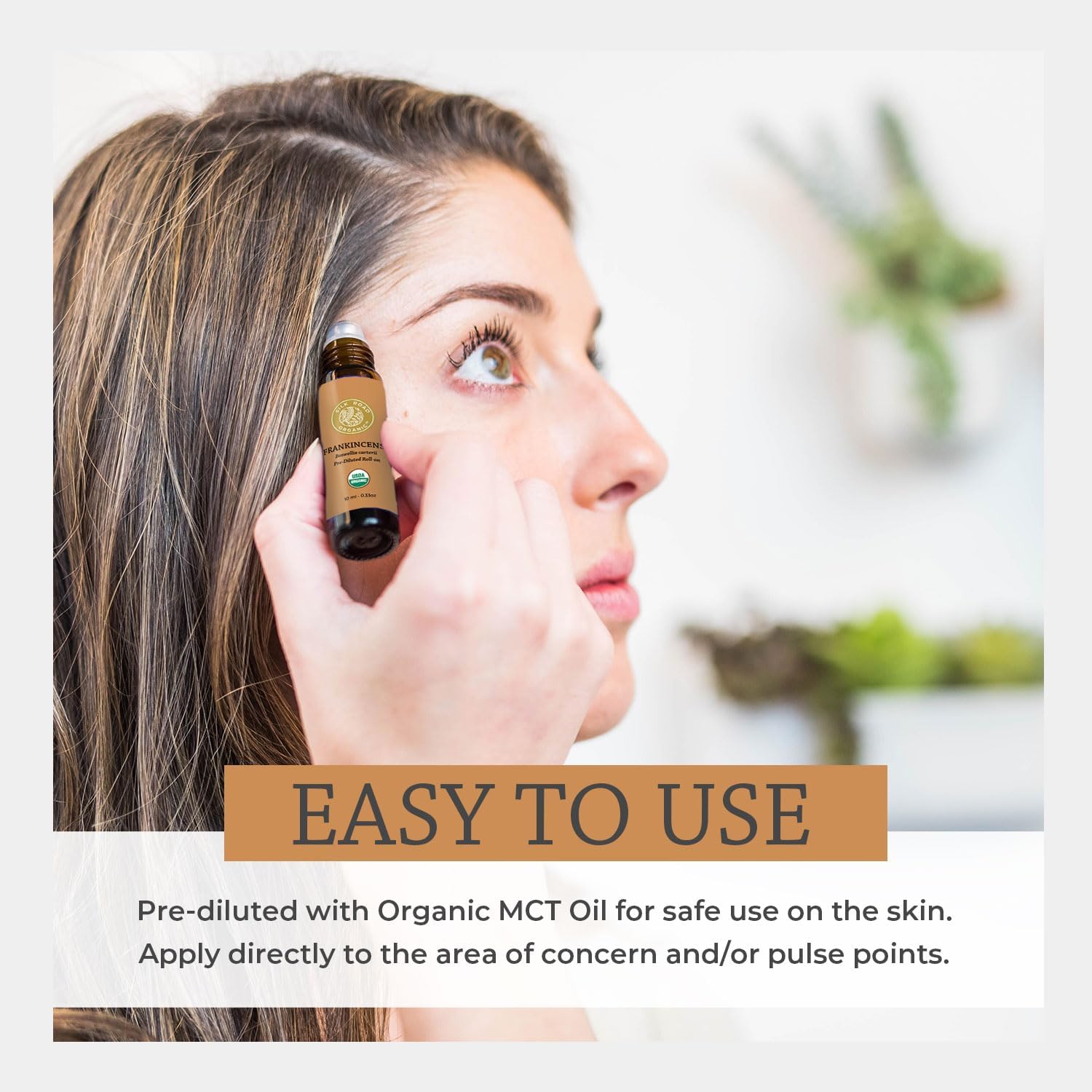 - 100% PURE, NATURAL, NON-GMO USDA Certified Organic essential oil roll-on. Considered a deeply spiritual oil, Frankincense Carterii is described as, earthy, with a deep soft amber note and highlights of honey, black pepper and fresh citrus. It’s smooth and balanced aroma helps enhance concentration and encourage a sense of calm.