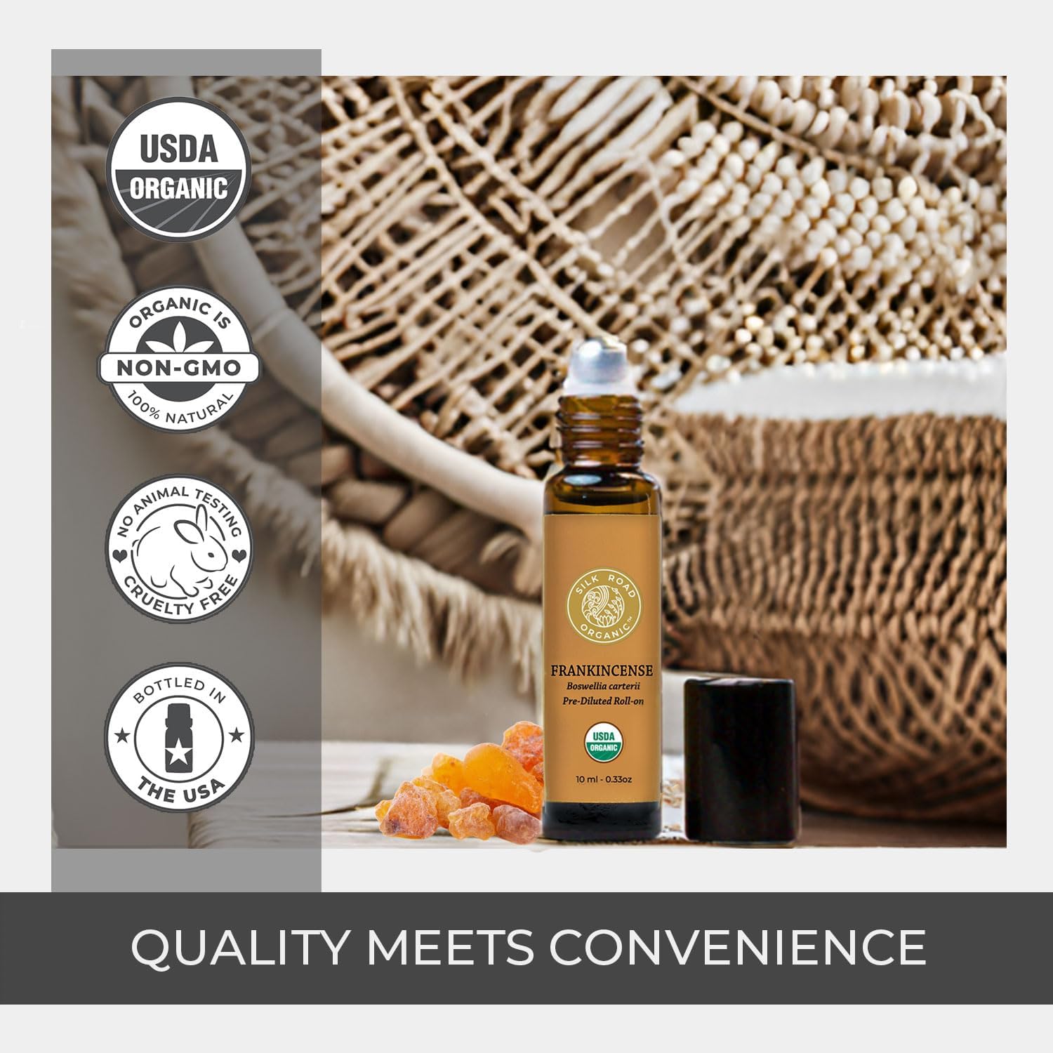 Silk Road Organic Frankincense Carterii Essential Oil Roll On, 100% Pure USDA Certified Aromatherapy for Radiant Skin, Body Aches, Stress Relief, & Calm - 10 ml Roller