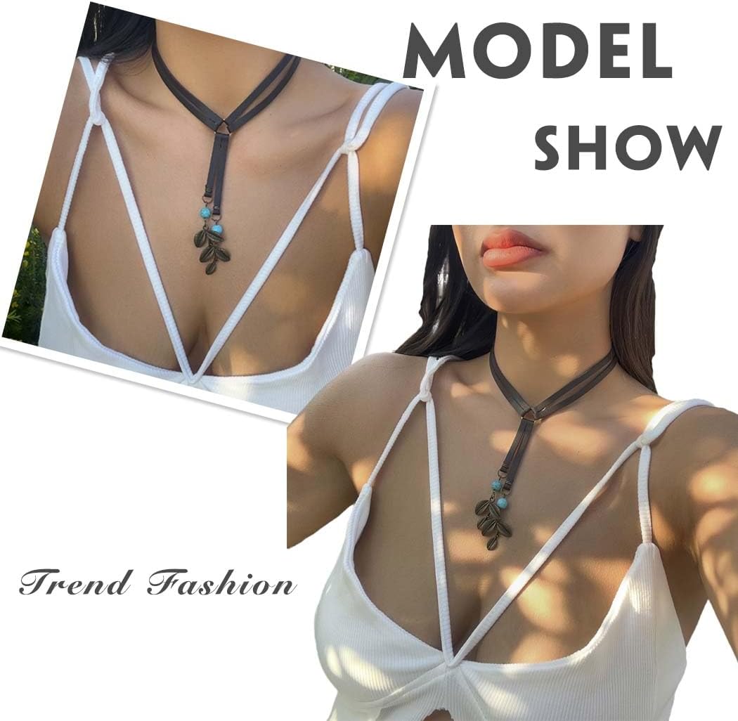 Y2K Necklace Puffy Turquoise Beaded Necklaces Pendant Boho Necklace Leather Choker Wrap Necklaces Jewelry for Women