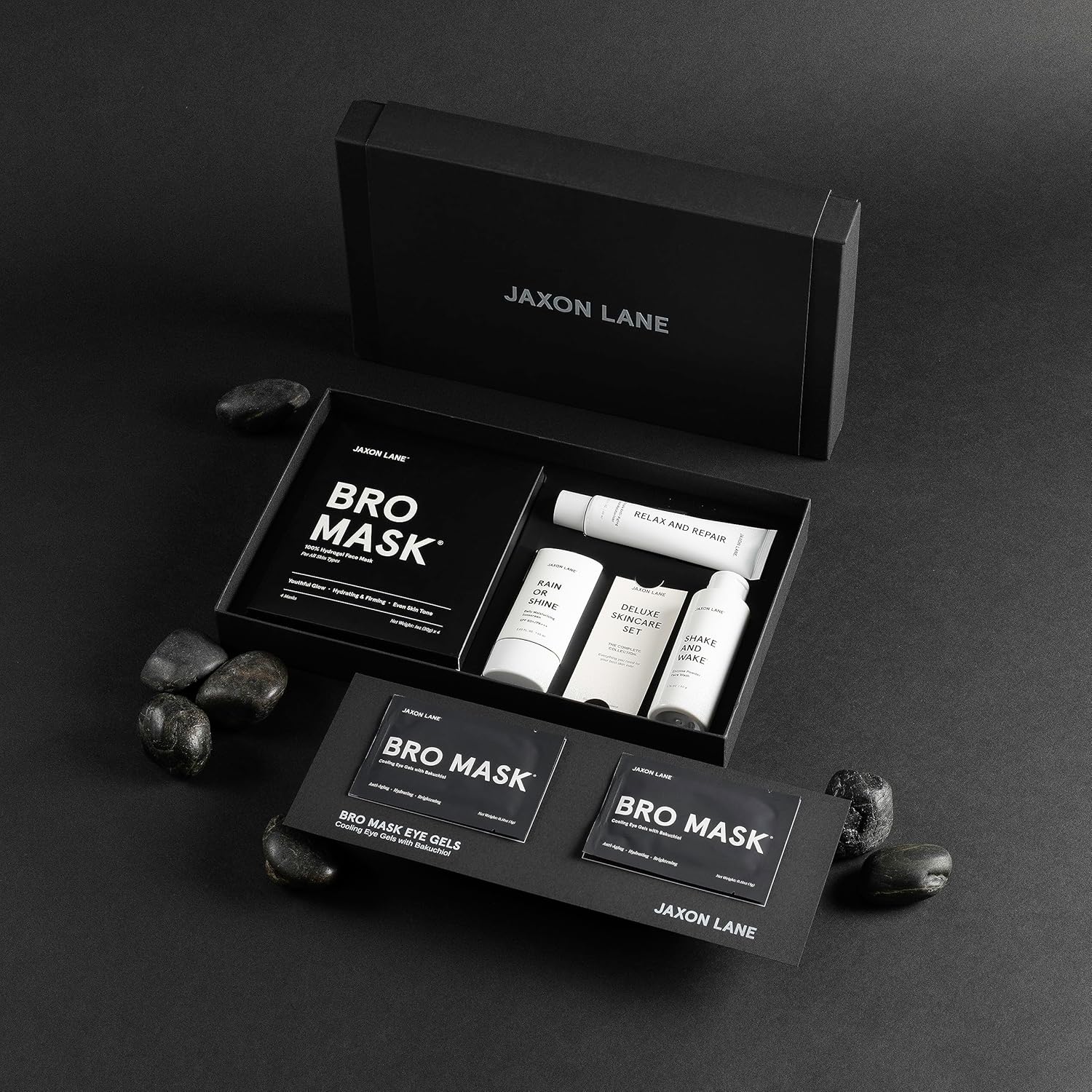 Skin Care Set: Deluxe Skincare Routine Gift Set 5pc, Mens Facial Care kit with Jaxon Lane Sunscreen, Bro Mask Sheet Mask & Eye Gels, Powder Face Wash and Moisturizer Set, Anti Aging Face Care for Men