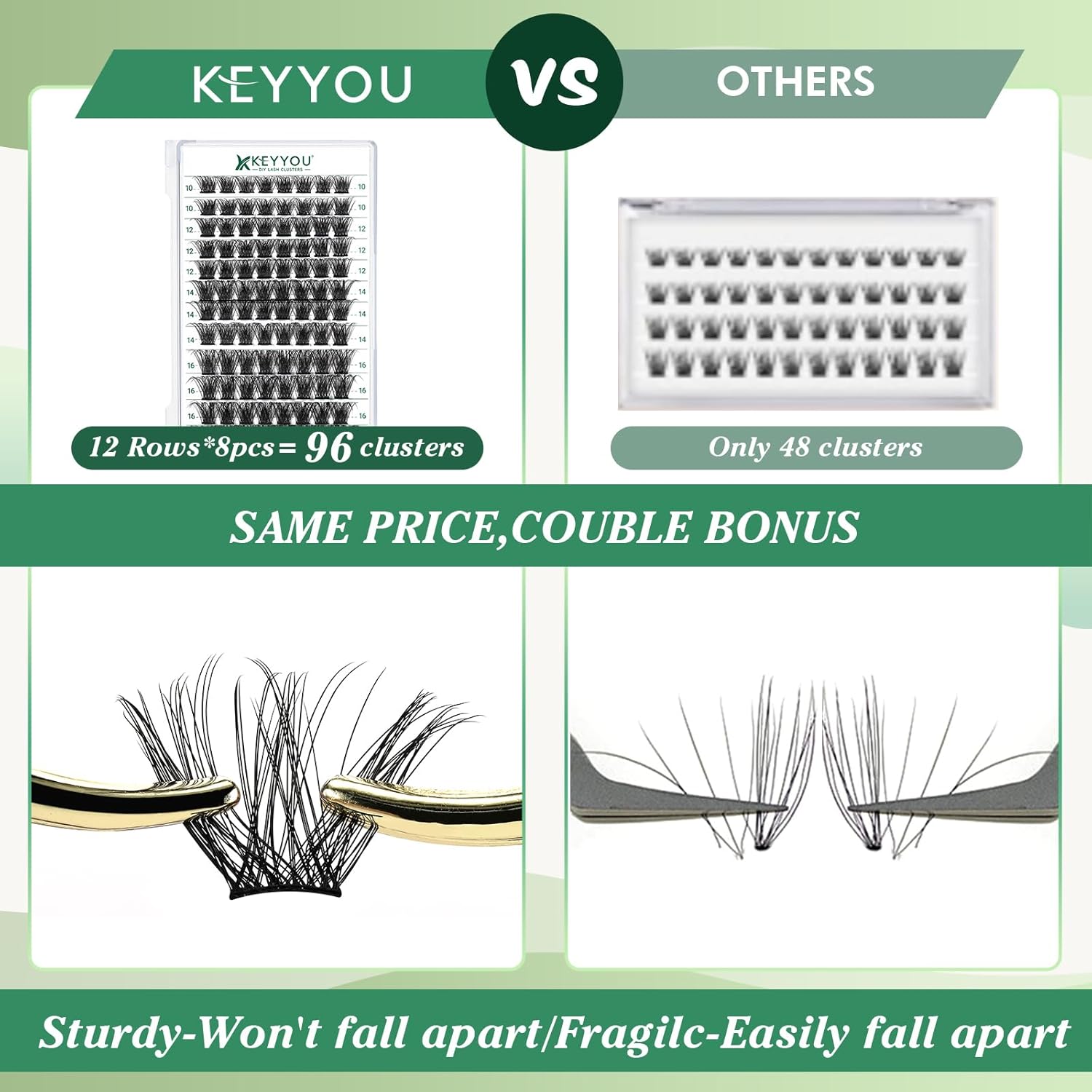 - 【Soft&Comfortable】KEYYOU lash cluster are made of imported materials,the stem line is thinner and softer, the eyelash cluster are lighter and more comfortable to wear.96 clusters in one tray ,more cost-effective.