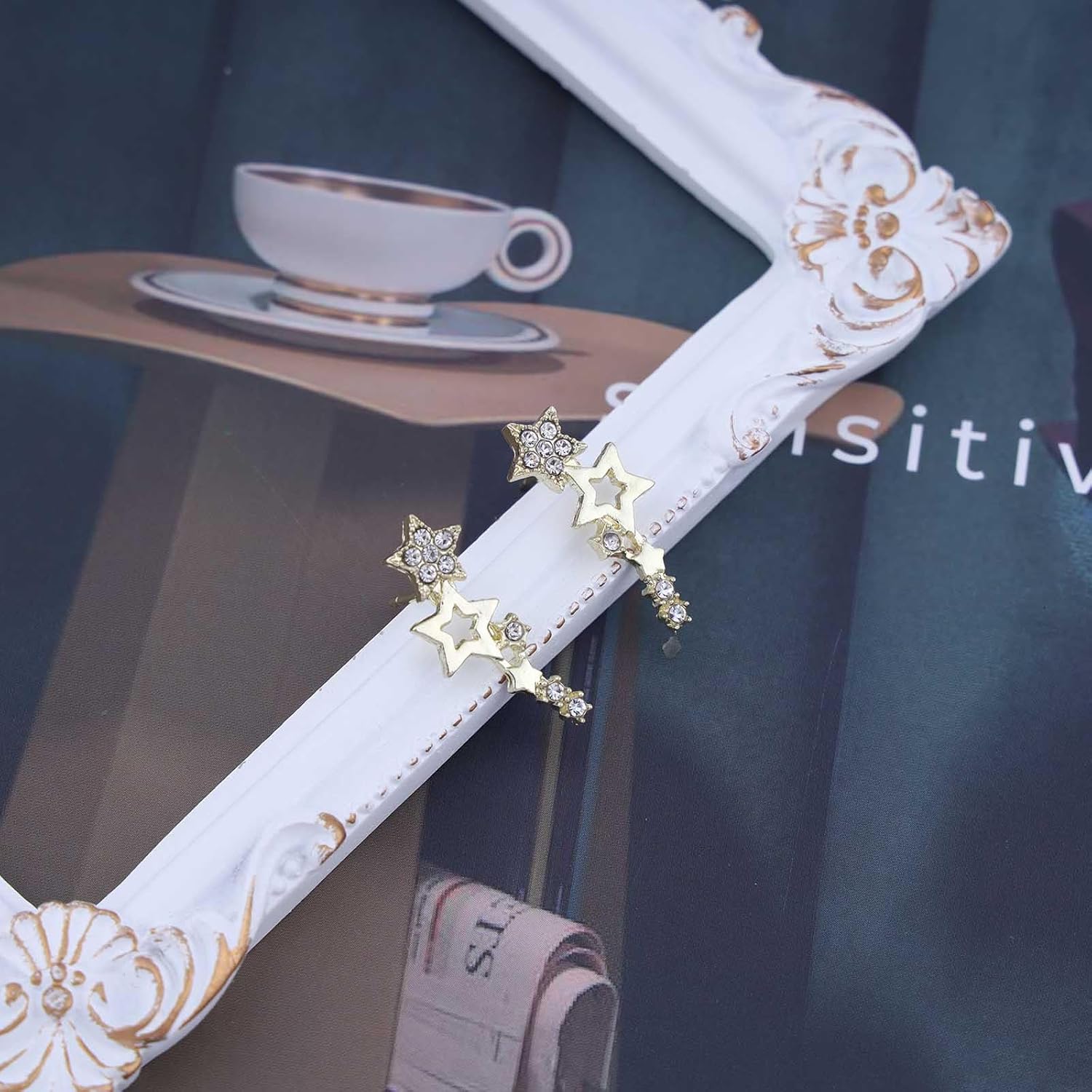 - Crystal star climber earrings.Item Details:Handmade Item.Size:As Shown.Color:Gold.Materials:Quality Alloy/Crystal.Location:Ear.Style:Boho/Vintage.