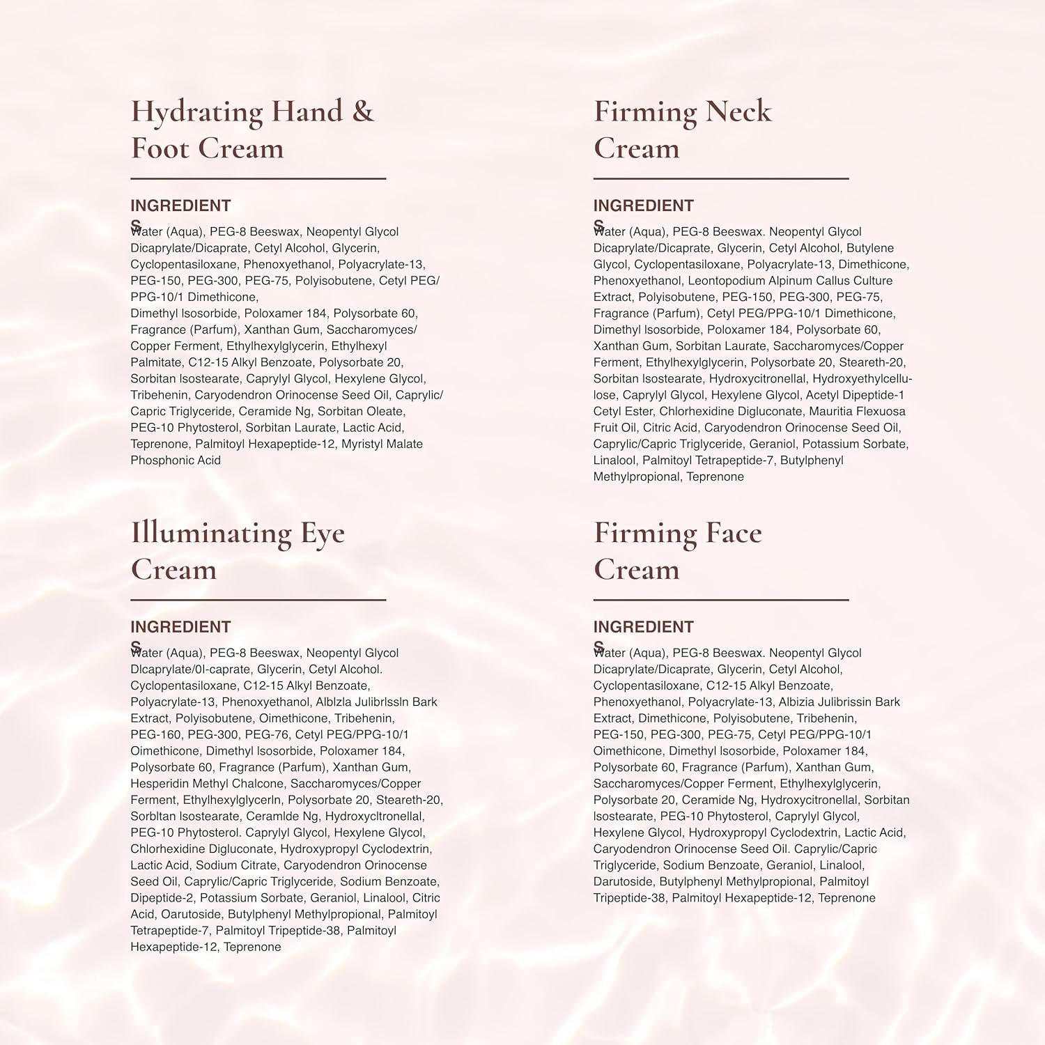 - Eye Cream & More: This neck cream aids the appearance of dark circles, under eye bags, wrinkles and puffiness; and our hand and foot cream supports intense moisturization