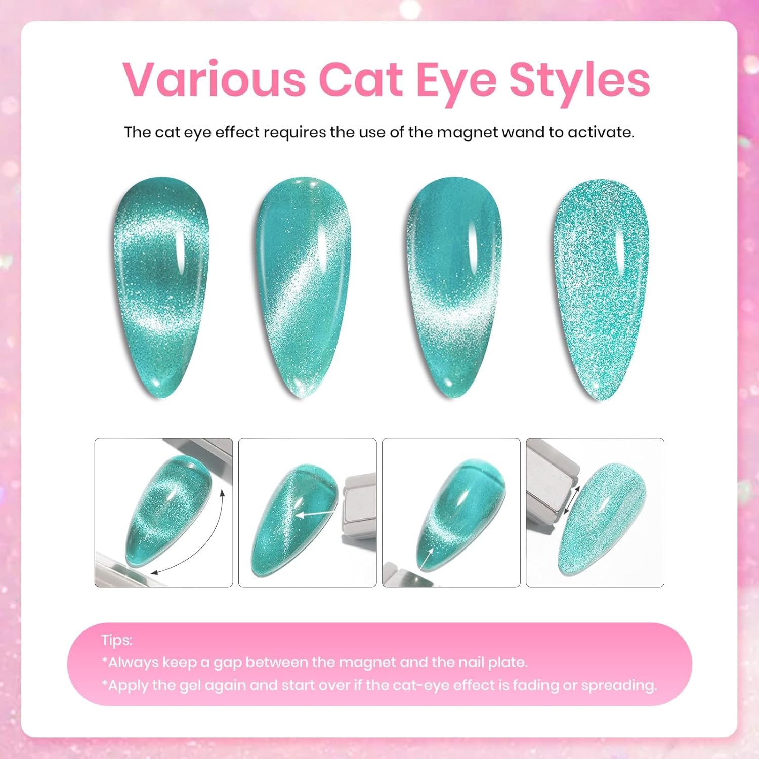 - 【Valentines Gel Nail Polish】6 Colors Holographic Glitter Cat Eye Gel Polish of 7.5ml /0.25fl.oz each and one magnet for various cat eye nail art designs. Professional Uv Led cured cat eye gel nail polish for infinite styles. Tips: Place the magnetic stick over the surface about 3-5mm for 5-10 secs to get your desired effect !!!!!