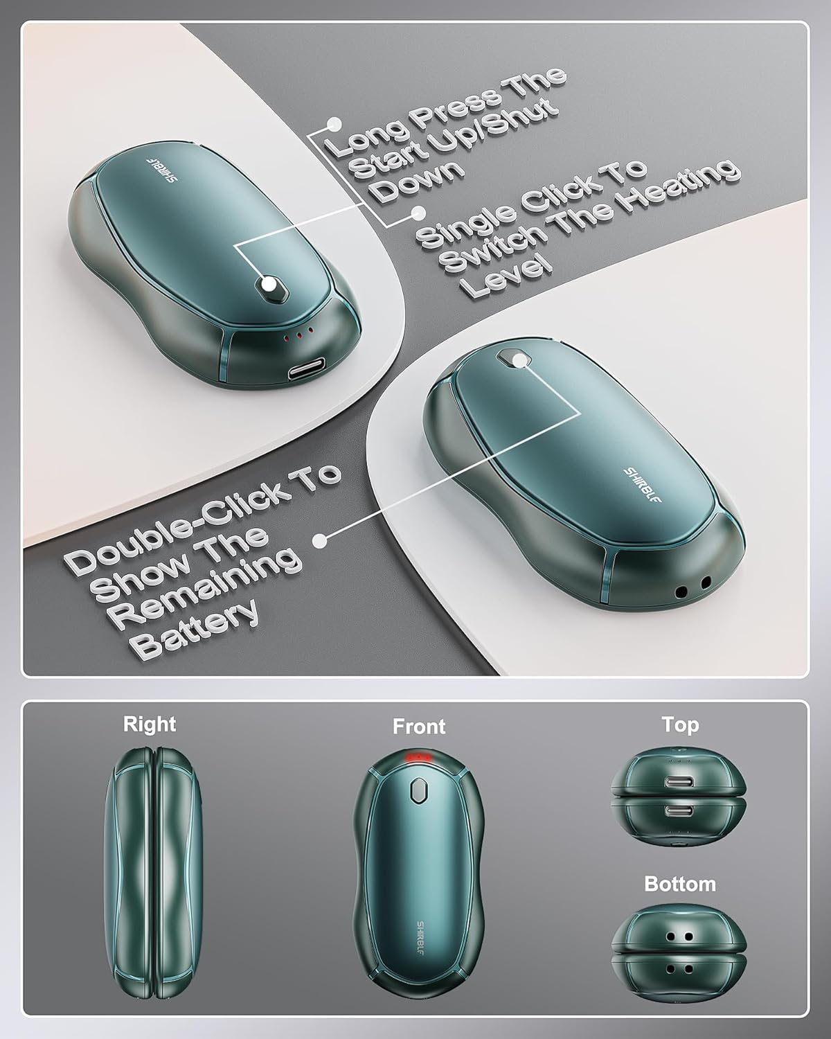 - 【Battery Level Alert】Double tap the on button at the top of the rechargeable heater to check the power level. When the handwarmer is low on power during use, the indicator lights on both sides of the on button will blink to indicate this. Remind to charge in time for next use.