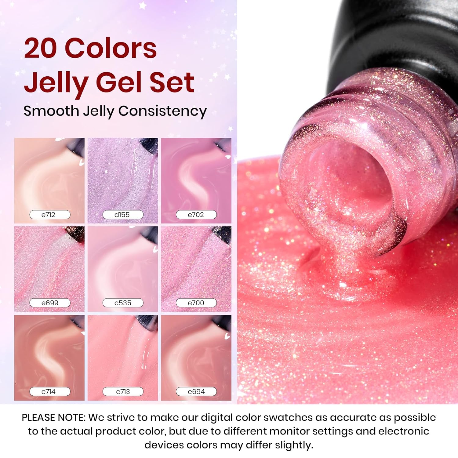 Beetles Jelly Gel Nail Polish Set, 25PCS 20 Colors Sheer Neutral Nude Pink Glitter Milky White Gel Nail Kit Soak Off UV with Base Glossy Matte Top Coat Pearls Rhinestones Nail Charms Gift for Women