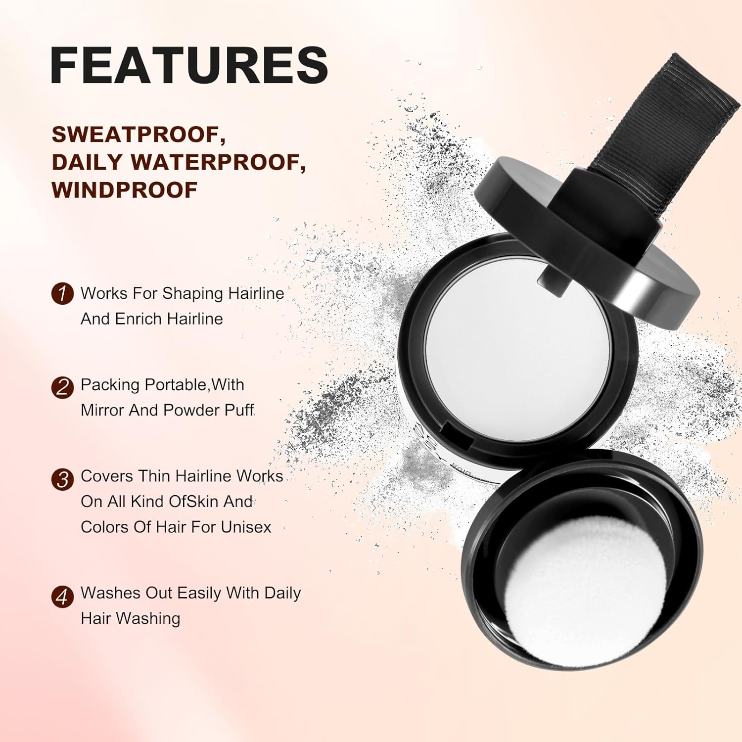 - 1.Instant Coverage Hair Root Touch Up -The Acosexy Hairline Powder puff can accurately cover the roots of hair. Locks on Until You Shampoo: Hair loss? Skip the embarrassing all-day touch-ups .The color is firm. Make the hair fluffy. Will Makes hair color natural and vibrant. Great for all hair types and texture!