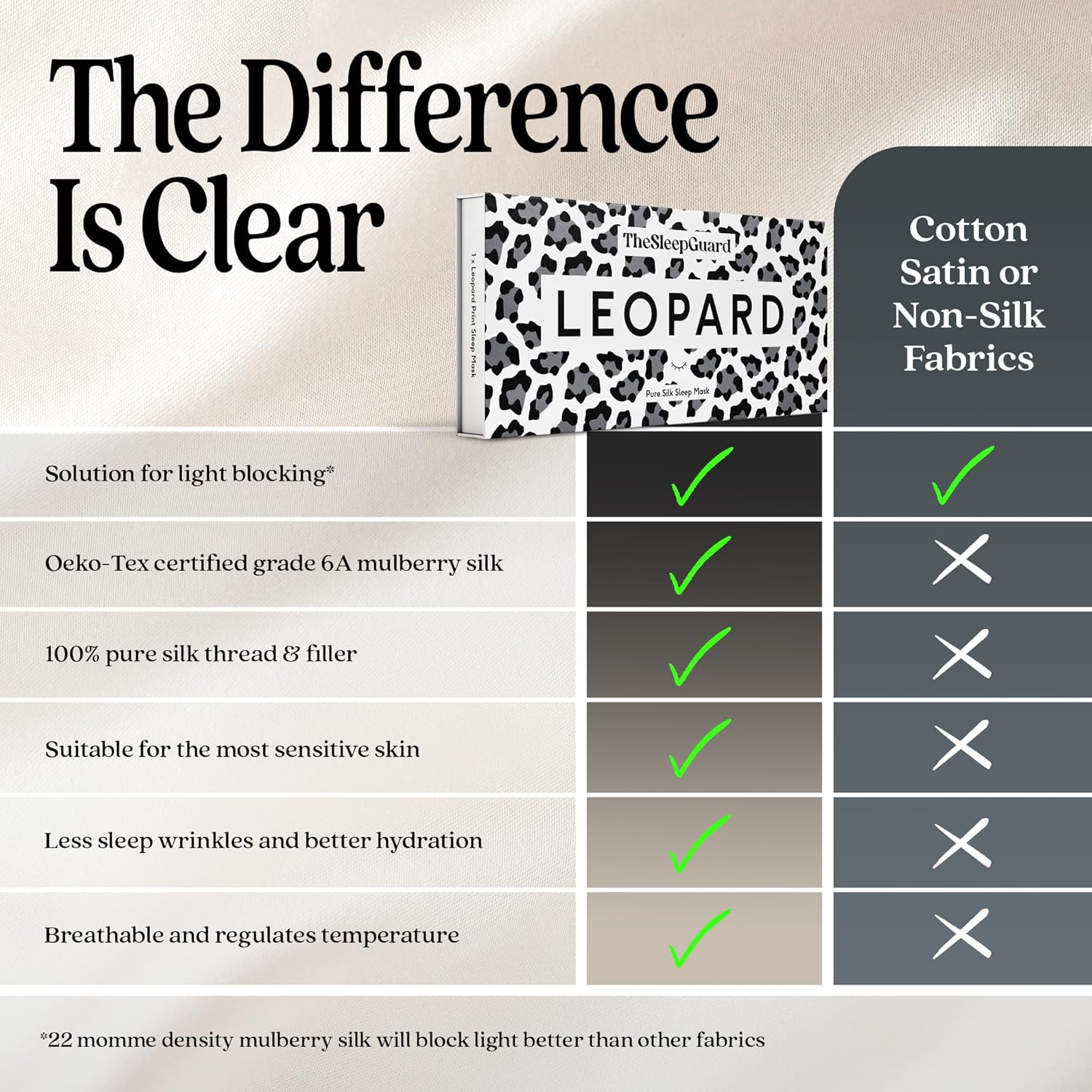- ✅ INVEST IN YOUR SLEEP - Experience TheSleepGuard difference with our luxury sleeping masks. Crafted from the highest grade 6A Mulberry silk at 22 momme and certified by Oeko-Tex to ensure you sleep soundly. Remember, better sleep leads to a better you.