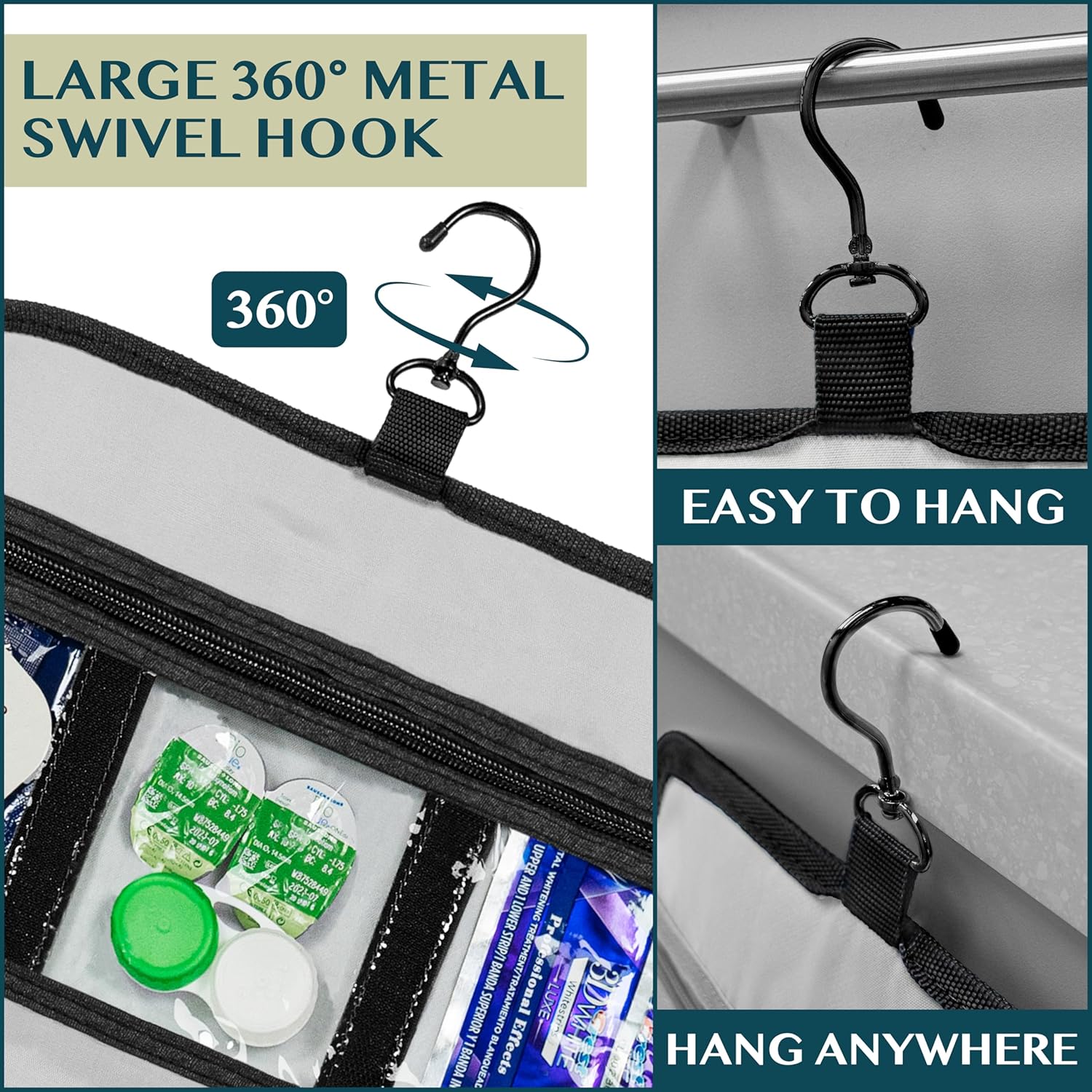 - HANGING COSMETICS TRAVEL BAG ORGANIZER: This toiletry bag for women has a hanging hook and multiple pockets that help you stay organizer during business trip, vacation travel. The hanging hook makes it easy to hang the toiletry bag to bars in the hotel shower bathroom. Unzip your toiletry bag to reveal compartments to organize your shampoo, skincare face hygiene products. This toiletry travel bag is an essential accessory for cruise in Europe, plane, Hawaii Trip, and honeymoon.
