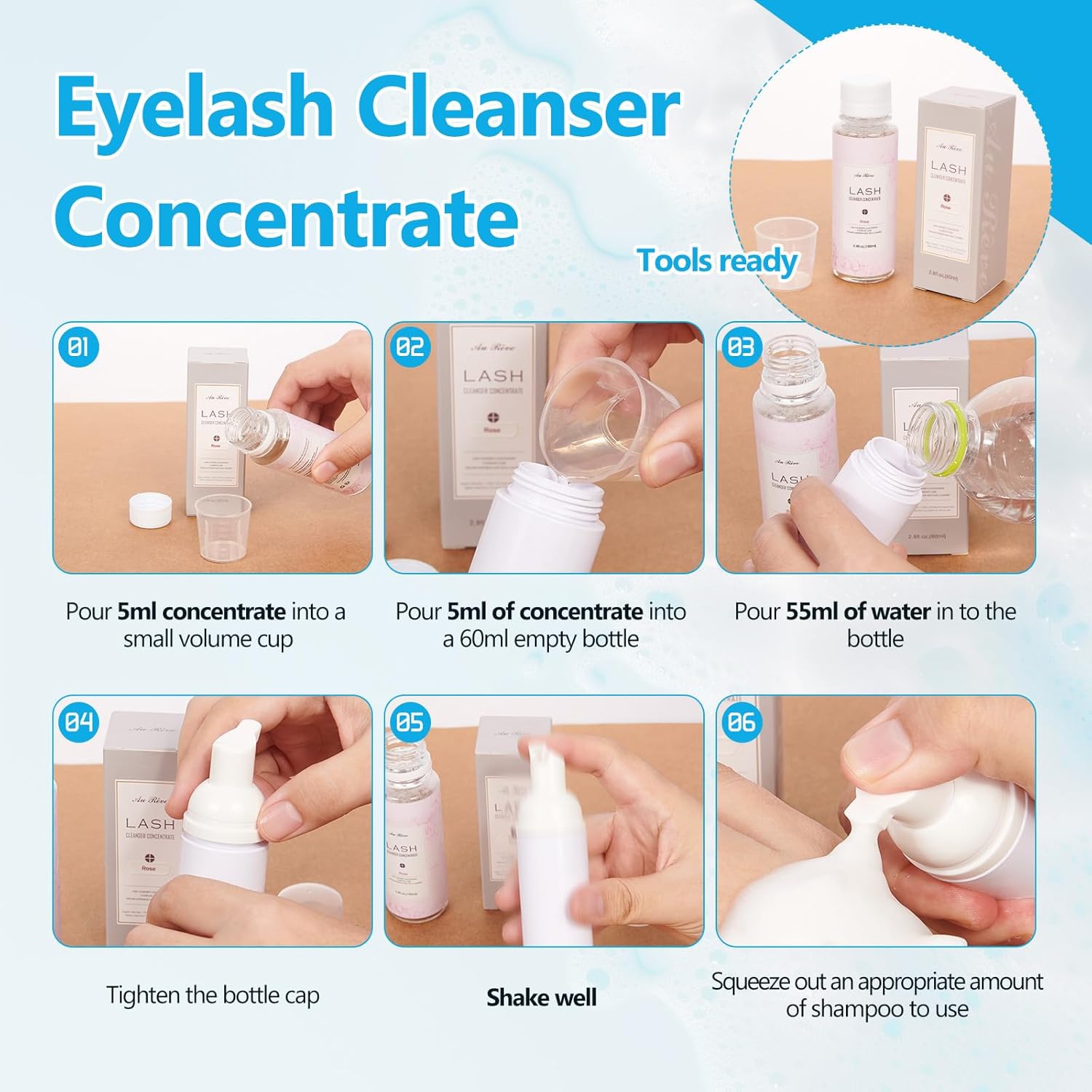 - Directions Mix 5 ml of serum and 55 ml of distilled water in the ratio of 1:11 in a 60 ml shampoo bottle and shake well. Take care to mix in the correct ratio.In addition, the product comes with a small cup with a graduated scale for you to dispense your eyelash shampoo.