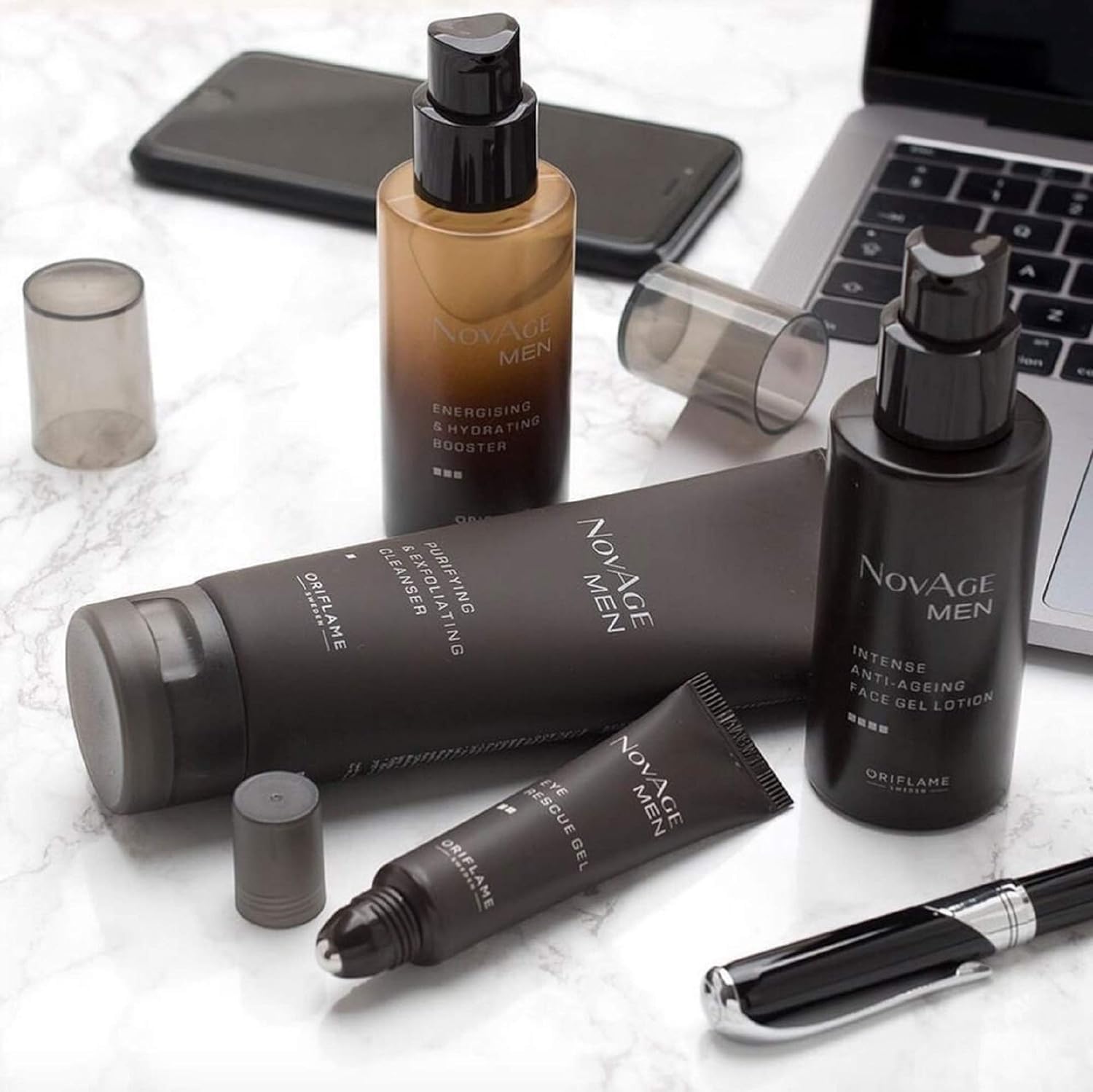 - The NovAge Men Set is engineered specifically for male skin to fight signs of ageing and tiredness. Skin is left feeling energised, fresher, smoother and younger looking. Contains Purifying & Exfoliating Cleanser, Eye Rescue Gel, Energising & Hydrating Booster and Intense Anti-ageing Face Gel Lotion. Designed for use as a simple, but powerful routine that takes less than 2 minutes to perform, every morning and evening