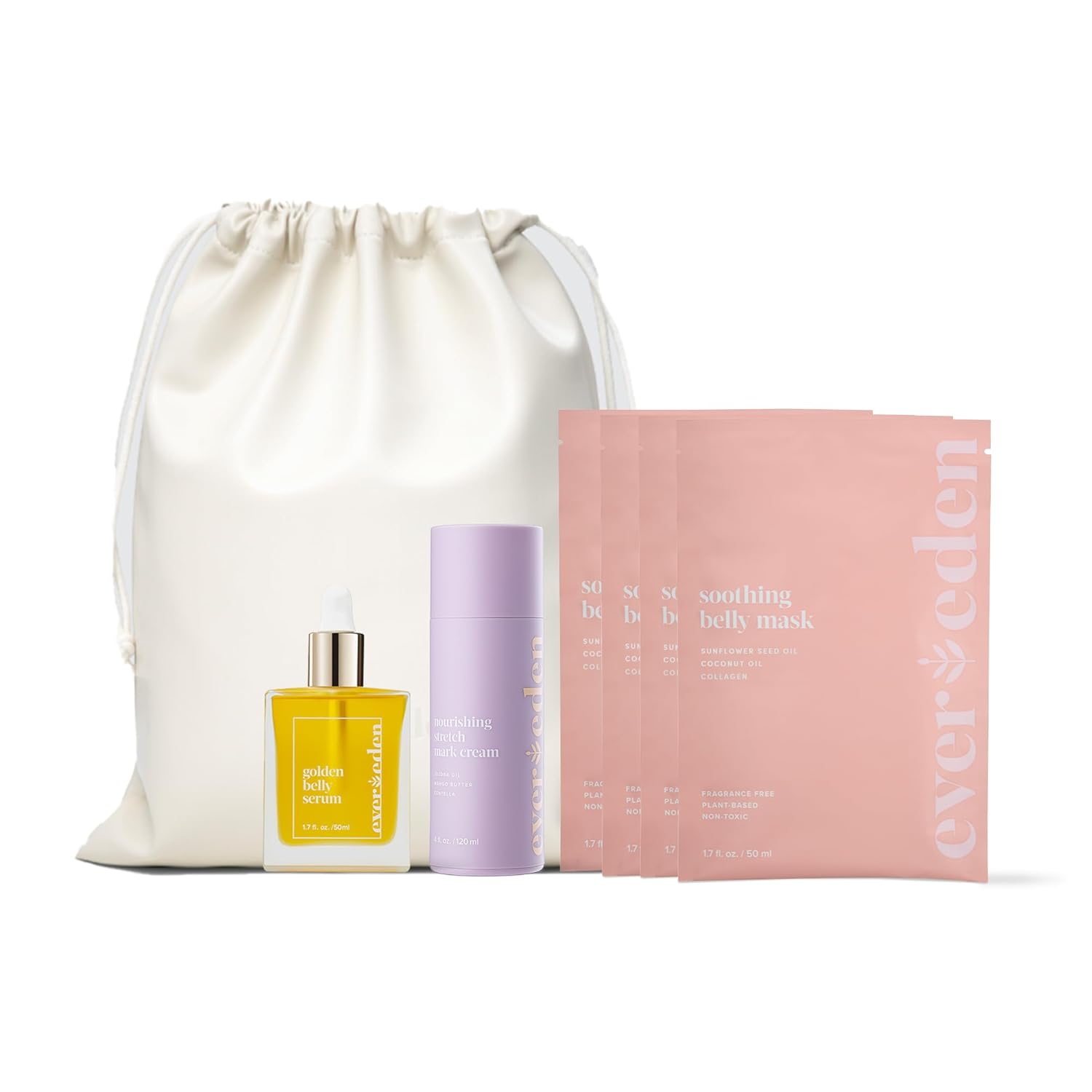 Evereden Nourishing Stretch Mark Cream, 4.0 fl oz. & Golden Belly Serum, 1.7 fl oz. & Soothing Belly Mask for Stretch Marks - 2nd/3rd Trimester Size, 4 pack | 3 Item Bundle Set | Pregnancy Skincare