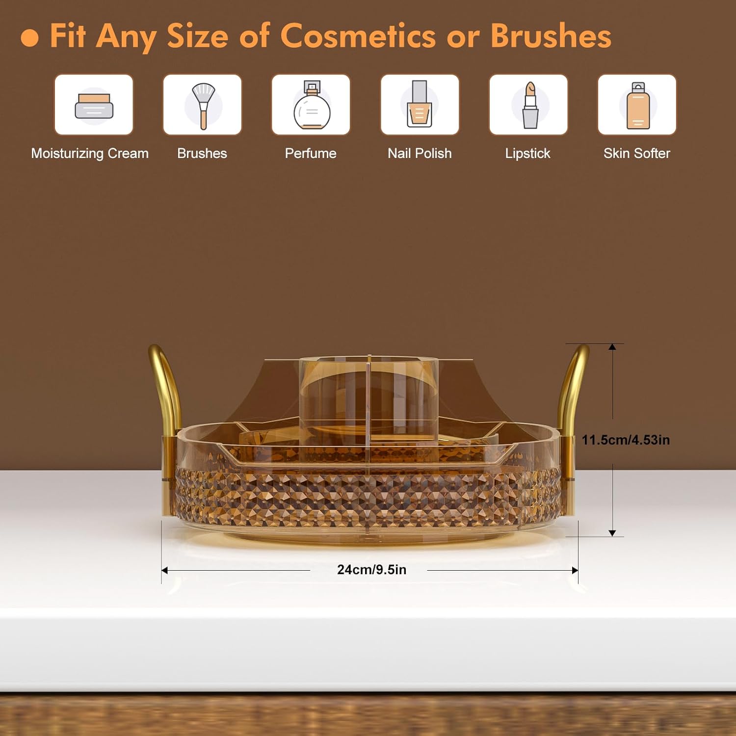 - Washable and Metal Stand:➤Awenia cosmetic organizer with clear acrylic material can be washed or wiped with a damp cloth,cleaned as good as new.Gold stainless steel stand and unique diamond pattern make the perfume organizer more strong,firm beautiful and easy to move. The 360 makeup organizer can be place in Dresser,Bathroom and Kitchen.