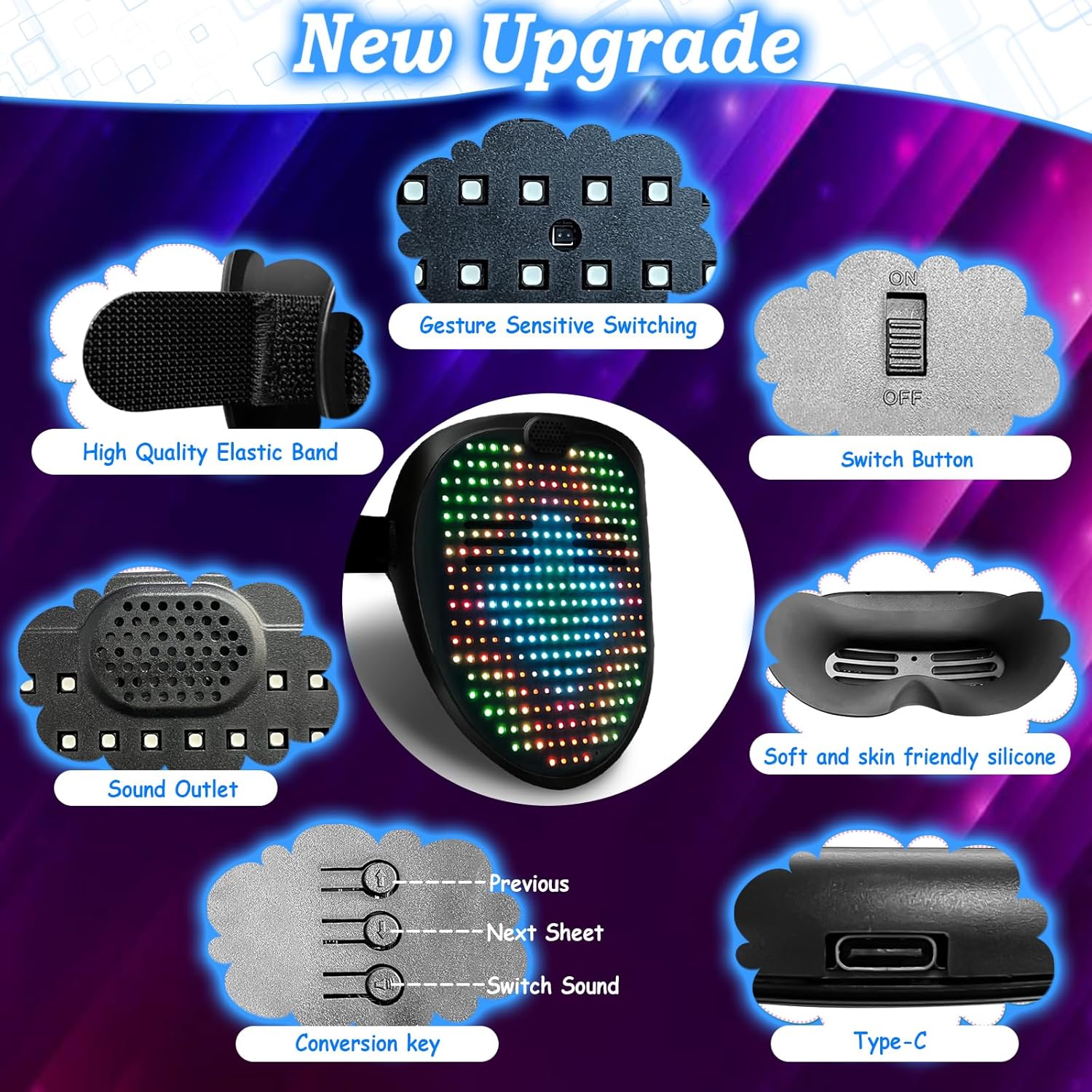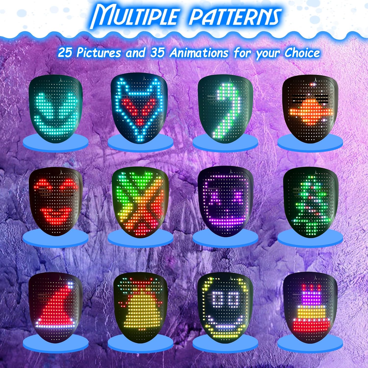 - [60 Patterns Display and Sound Effects]: COOLGUARDER Led mask has 35 dynamic display modes and 25 static display images. We added sound effects for the various patterns of Mask (some patterns have repeated sounds). Led mask can be set to single color, flash, gradient, smooth and multi-color patterns. Led Light up mask is the most amazing costume & cosplay mask, attracting everyone's attention.