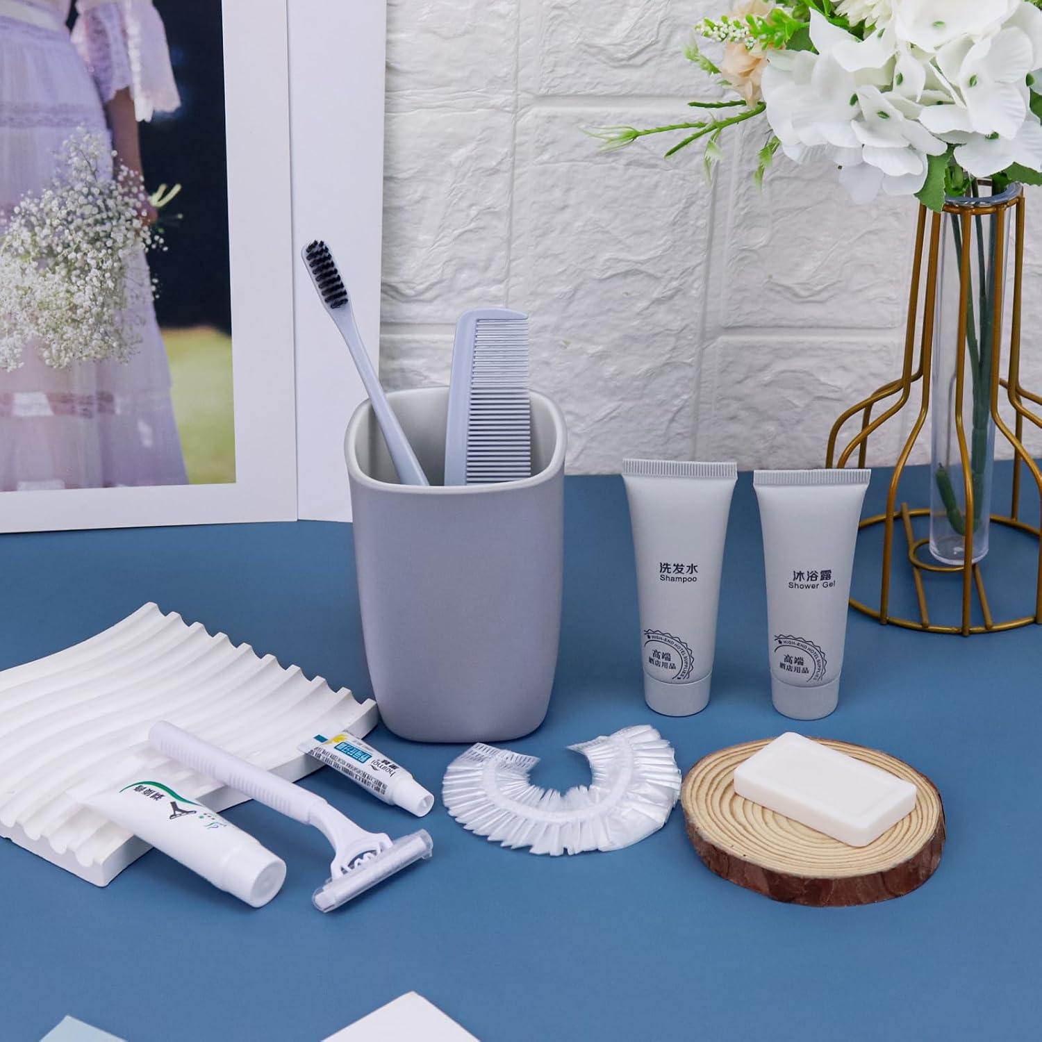 - More sets to match: our hygiene travel kit comes in a pack of 12 sets. Each travel size hygiene products bulk set consists of a Toothbrush, toothpaste, shaver, Shaving cream, comb, bath gel, shampoo, soap and bath cap. 9 items in a set. personal care travel size toiletries make it even more comprehensive, convenient and comfortable to use.