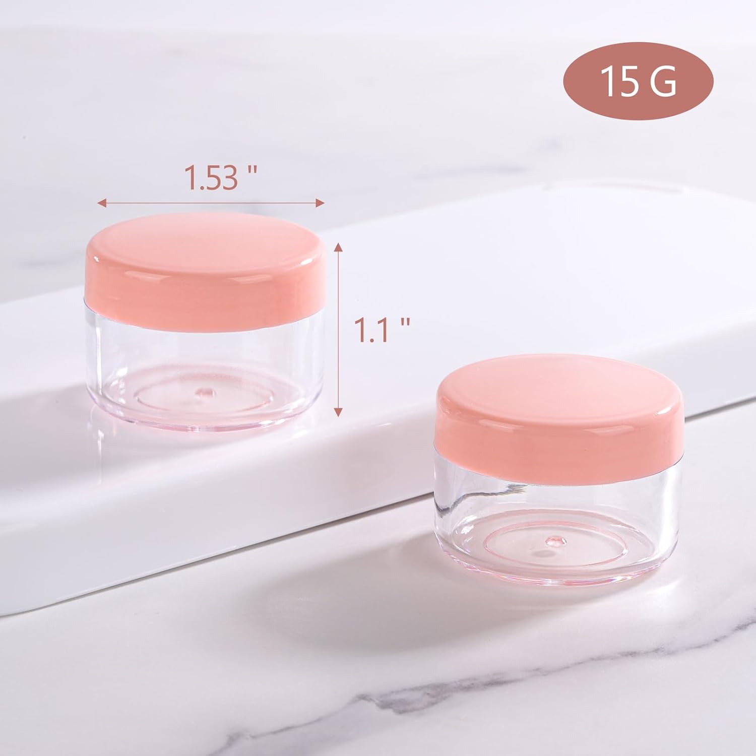 - Quantity: 100 pieces of plastic jars with lids ; Capacity: 15g/ 0.5oz . Perfect for storing lotions, lip balms, toners, creams, acrylic powder, and other beauty aids
