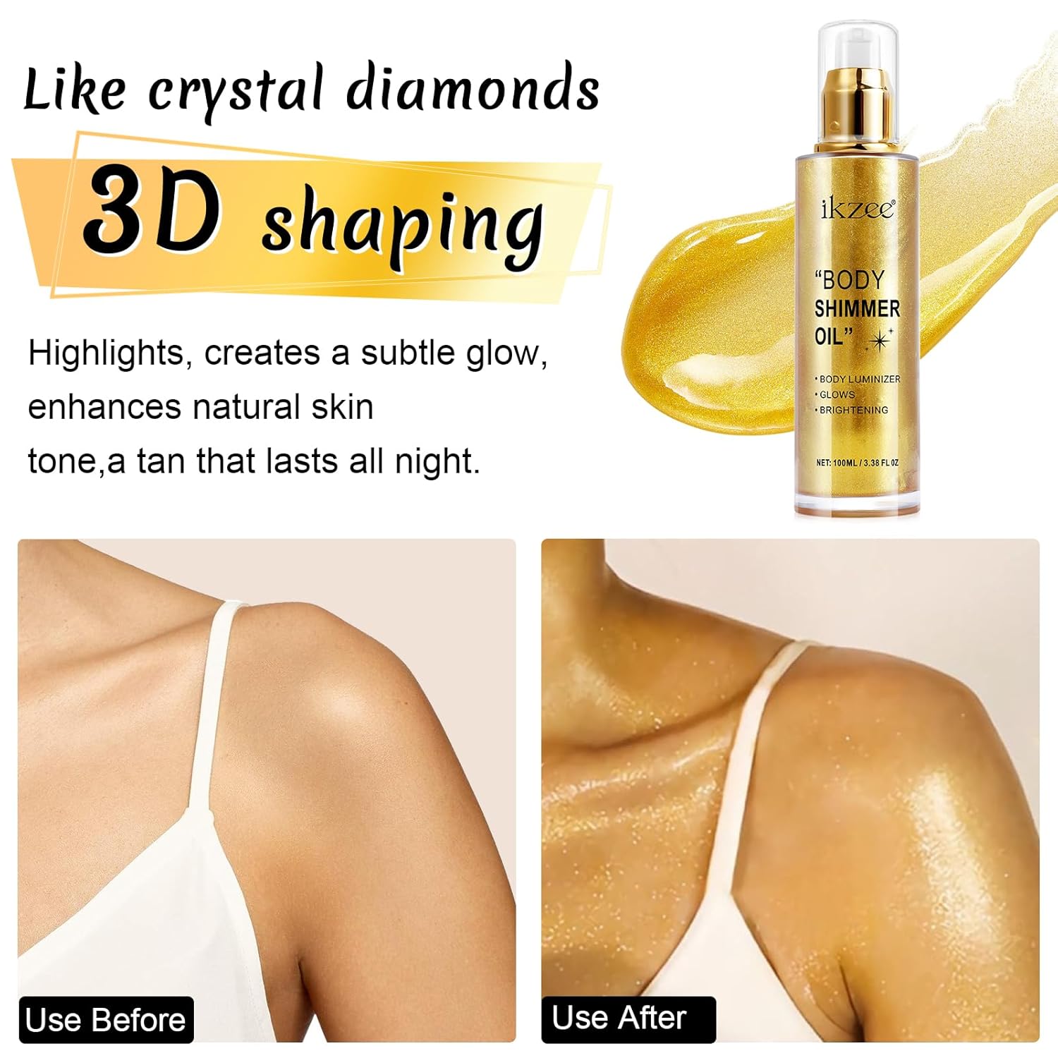 - ✦ SHIMMERING BODY GLOWING LUMINIZER -- This shimmer body oil brightens your complexion, the flecks of shimmer catch the light and make your skin glow, giving your skin an attractive shimmer in the sun, giving you a more natural and healthier complexion.